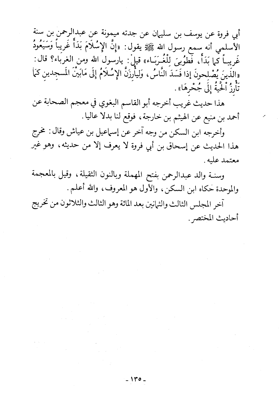 أبي فروة عن يوسف بن سليمان عن جدته ميمونة عن عبد الرحمن بن سنة الأسلمي أنه سمع رسول اللَّه -صلى اللَّه عليه وسلم-يقول: "إِنَّ الإِسُلَامَ بَدَأَ غَريبًا وَسَيَعُودُ غَريبًا كما بَدَأَ، فَطوُبَى لِلْغُرَبَاء" قيل: يا رسول اللَّه ومن الغرباء؟ قال: "الَّذينَ يُصْلِحونَ إذا فَسَدَ النَّاسُ، وَليأْرِزَنَّ الإِسُلَامُ إِلَى مَا بَيْنَ المَسجِدينِ كمَا تَأْرِزُ الحيَّةُ إِلَى جُحْرِهَا".