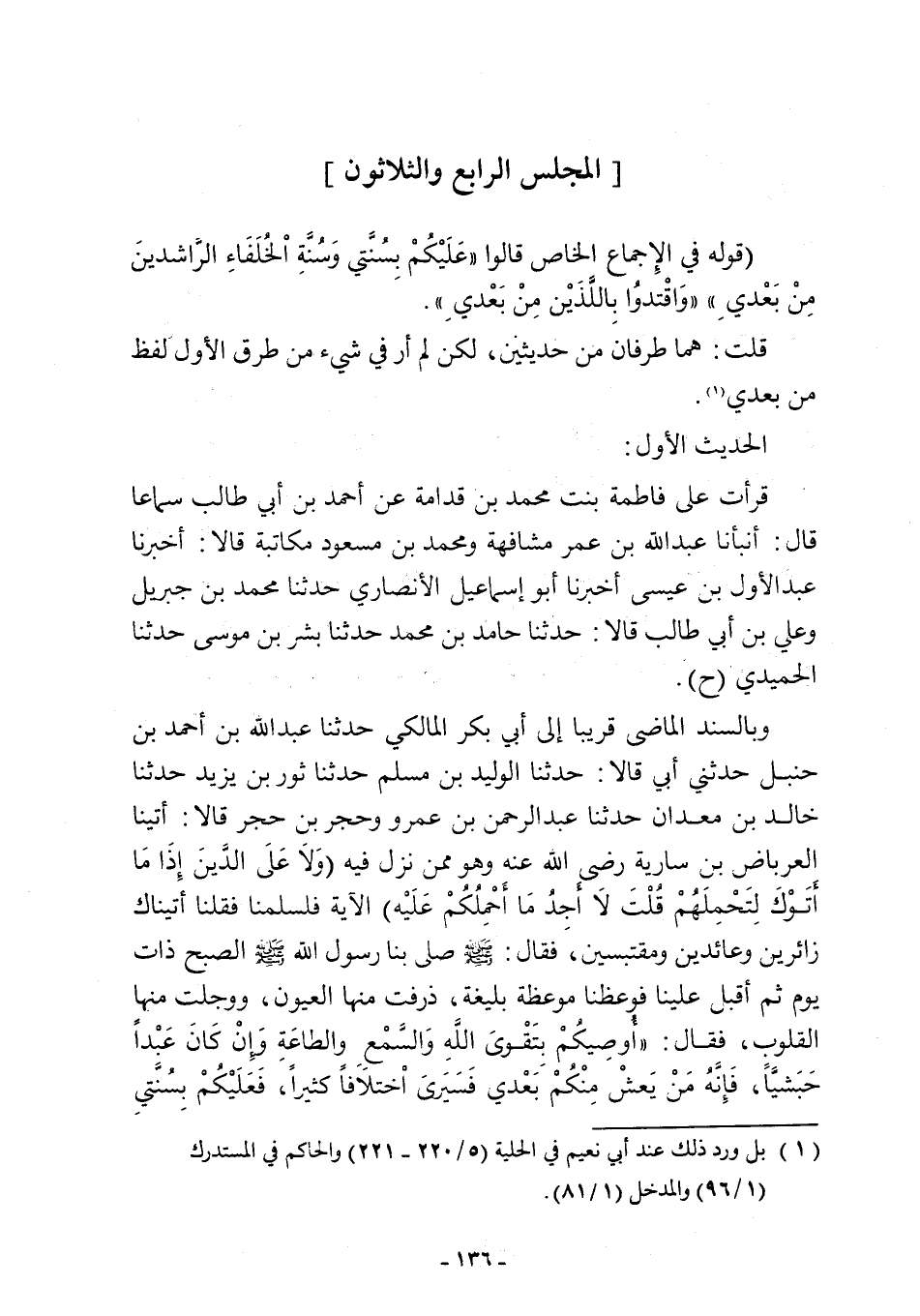 وبالسند الماضى قريبا إلى أبي بكر المالكي حدثنا عبد اللَّه بن أحمد بن حنبل حدثني أبي قالا: حدثنا الوليد بن مسلم حدثنا ثور بن يزيد حدثنا خالد بن معدان حدثنا عبد الرحمن بن عمرو وحجر بن حجر قالا: أتينا العرباض بن سارية رضي اللَّه عنه وهو ممن نزل فيه {وَلَا عَلَى الَّذِينَ إِذَا مَا أَتَوْكَ لِتَحْمِلَهُمْ قُلْتَ لَا أَجِدُ مَا أَحْمِلُكُمْ عَلَيْهِ} الآية فلسلمنا فقلنا أتيناك زائرين وعائدين ومقتبسين، فقال: -صلى اللَّه عليه وسلم- صلى بنا رسول اللَّه -صلى اللَّه عليه وسلم- الصبح ذات يوم ثم أقبل علينا فوعظنا موعظة بليغة، ذرفت منها العيون، ووجلت منها القلوب، فقال: "أُوصِيكُمْ بتَقْوىَ اللَّهِ وَالسَّمْع والطَاعَةِ وَإِنْ كَانَ عَبْدًا حَبَشيًّا، فَإِنَّهُ مَن يَعشْ مِنْكُمْ بَعْدي فَسَيَرى اختلَافًا كثيرًا، فَعَلَيْكُمْ بِسُنَّتي
