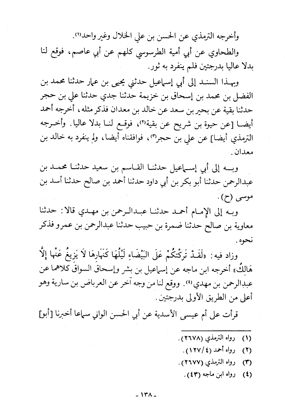 وزاد فيه: "لَقَدْ تَركْتكُمْ عَلى البَيْضَاءِ لَيْلُهَا كَنَهَارِهَا لَا يَزِيغُ عَنْها إِلَّا هَالِكٌ" أخرجه ابن ماجه عن إسماعيل بن بشر وإسحاق السواق كلاهما عن عبد الرحمن بن مهدي (¬4). ووقع لنا من وجه آخر عن العرباض بن سارية وهو أعلى من الطريق الأولى بدرجتين.
