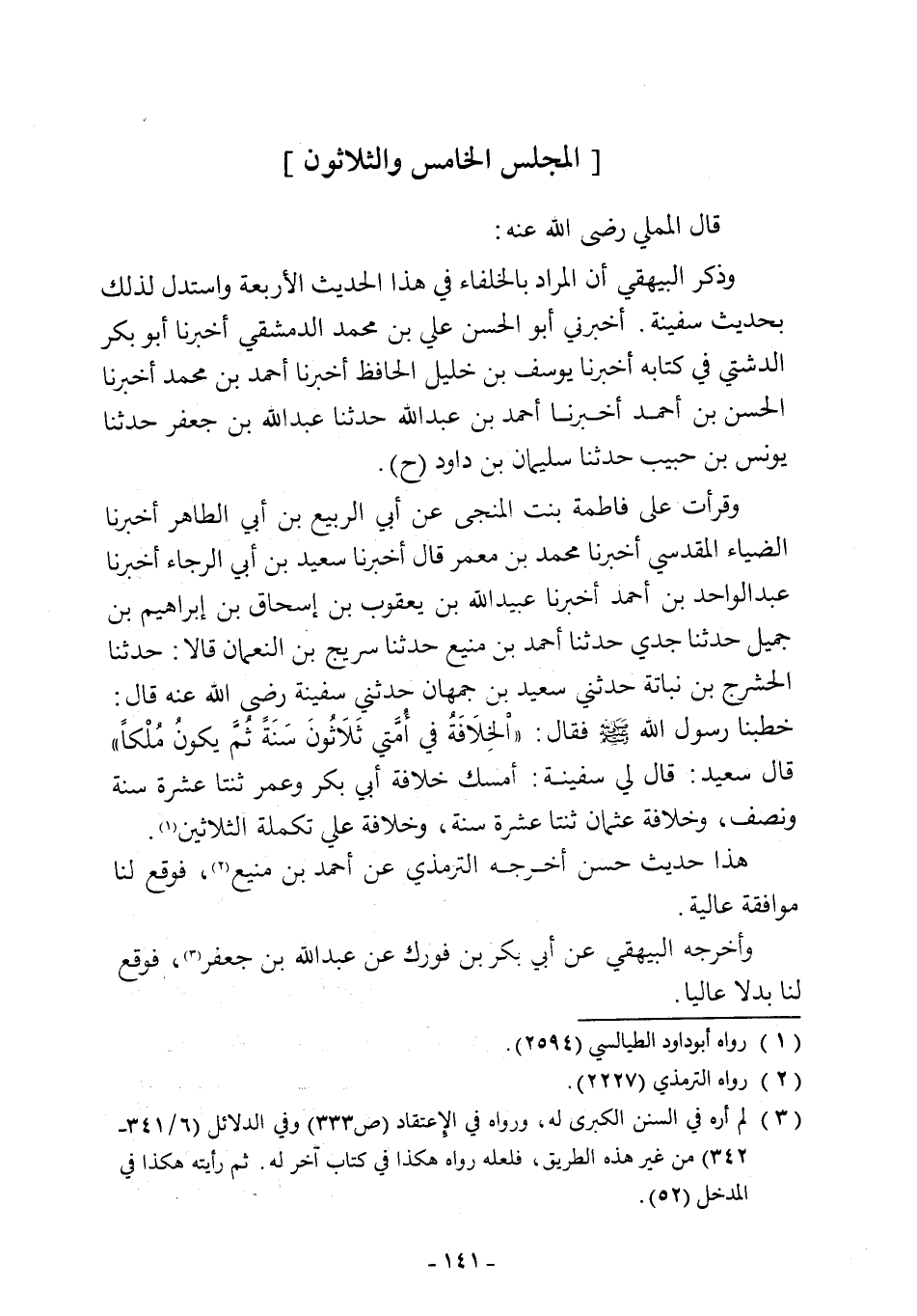 وقرأت على فاطمة بنت المنجى عن أبي الربيع بن أبي الطاهر أخبرنا الضياء المقدسي أخبرنا محمد بن معمر قال أخبرنا سعيد بن أبي الرجاء أخبرنا عبد الواحد بن أحمد أخبرنا عبيد اللَّه بن يعقوب بن إسحاق بن إبراهيم بن جميل حدثنا جدي حدثنا أحمد بن منيع حدثنا سريج بن النعمان قالا: حدثنا الحشرج بن نباتة حدثني سعيد بن جمهان حدثني سفينة رضي اللَّه عنه قال: خطبنا رسول اللَّه -صلى اللَّه عليه وسلم- فقال: "الخِلَافَةُ في أُمَّتي ثَلَاثُونَ سَنَةً ثُمَّ يكونُ مُلْكًا" قال سعيد: قال لي سفينة: أمسك خلافة أبي بكر وعمر ثنتا عشرة سنة ونصف، وخلافة عثمان ثنتا عشرة سنة، وخلافة علي تكملة الثلاثين (¬1).