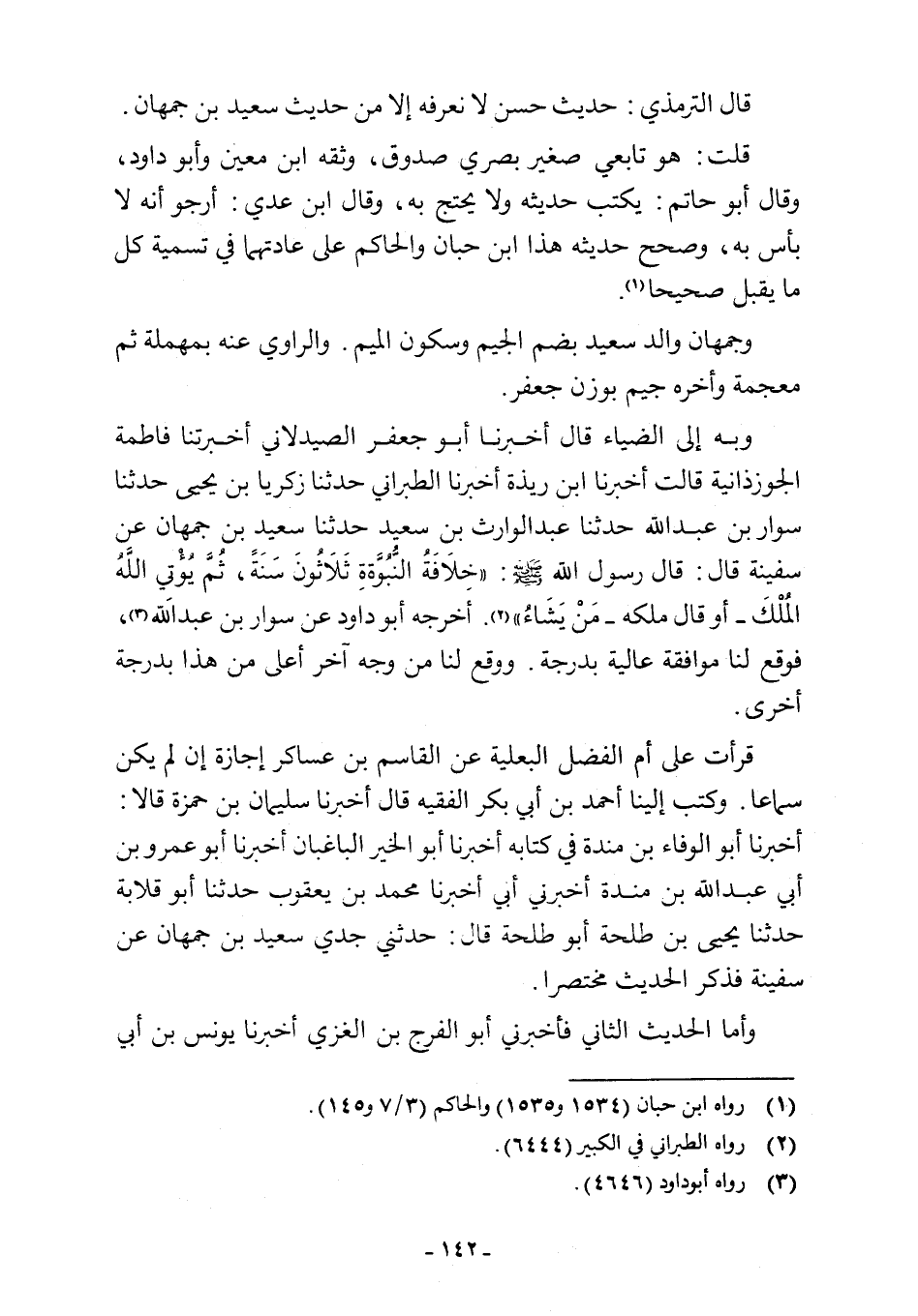 قرأت على أم الفضل البعلية عن القاسم بن عساكر إجازة إن لم يكن سماعا. وكتب إلينا أحمد بن أبي بكر الفقيه قال أخبرنا سليمان بن حمزة قالا: أخبرنا أبو الوفاء بن مندة في كتابه أخبرنا أبو الخير الباغبات أخبرنا أبو عمرو بن أبي عبد اللَّه بن مندة أخبرني أبي أخبرنا محمد بن يعقوب حدثنا أبو قلابة حدثنا يحيى بن طلحة أبو طلحة قال: حدثني جدي سعيد بن جمهان عن سفينة فذكر الحديث مختصرا.