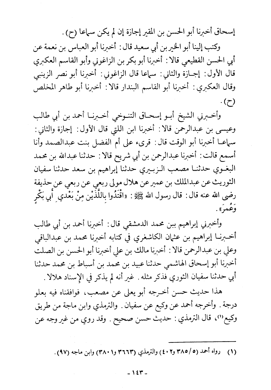 وأخبرني الشيخ أبو إسحاق التنوخي أخبرنا أحمد بن أبي طالب وعيسى بن عبد الرحمن قالا: أخبرنا ابن اللتي قال الأول: إجازة والثاني: سماعا أخبرنا أبو الوقت قال: قرئ على أم الفضل بنت عبد الصمد وأنا أسمع قالت: أخبرنا عبد الرحمن بن أبي شريح قالا: حدثنا عبد اللَّه بن محمد البغوي حدثنا مصعب الزبيري حدثنا إبراهيم بن سعد حدثنا سفيان الثوريث عن عبد الملك بن عمير عن هلال مولى ربعي عن ربعي عن حذيفة رضي اللَّه عنه قال: قال رسول اللَّه -صلى اللَّه عليه وسلم-: "اقْتَدُوا بِاللَّذَيْن مِنْ بَعْدي أَبي بَكْرٍ وَعُمرَ".