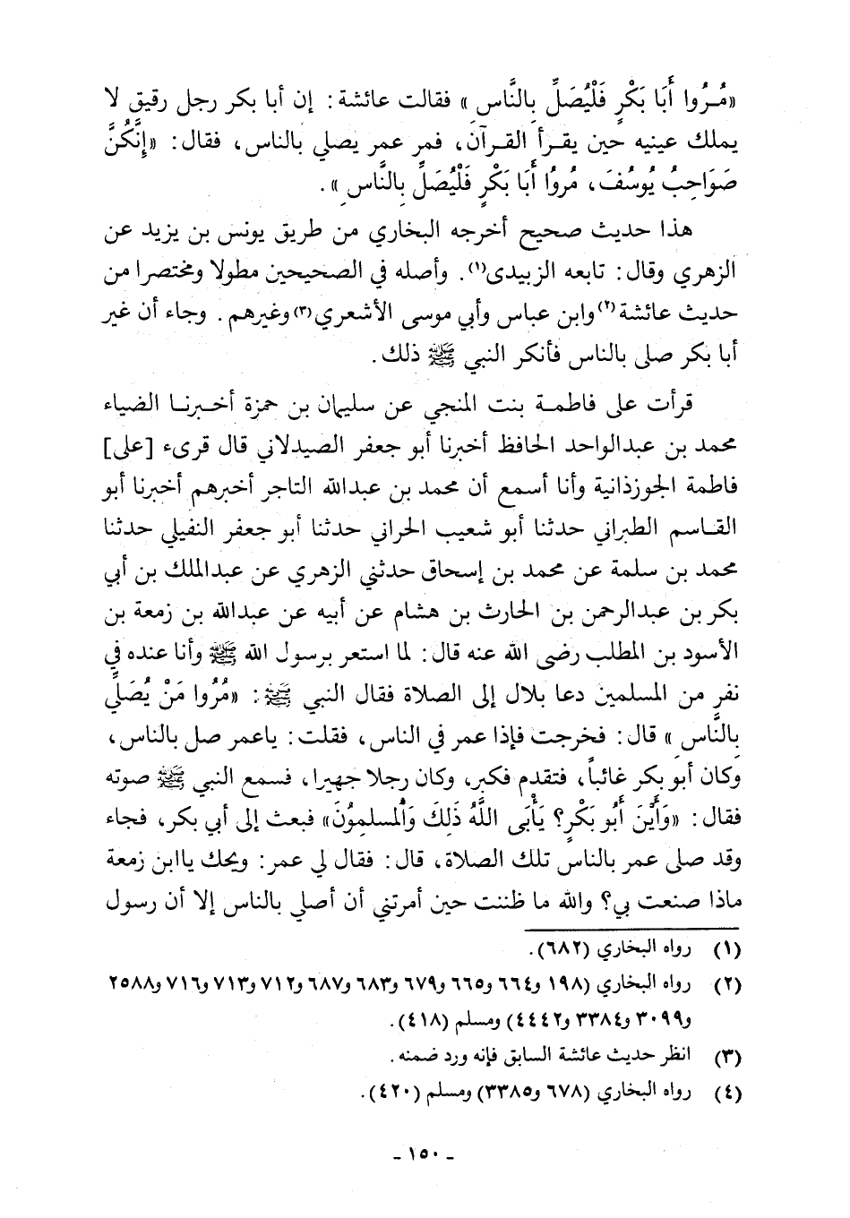 "مُرُوا أَبَا بَكْرٍ فَلْيُصَلِّ بالنَّاس" فقالت عائشة: إن أبا بكر رجل رقيق لا يملك عينيه حين يقرأَ القرآنَ، فمر عمر يصلي بالناس، فقال: "إِنَّكُنَّ صَوَاحِبُ يُوسُفَ، مُروُا أَبَا بَكْرٍ فَلْيُصَلِّ بِالنَّاسِ".