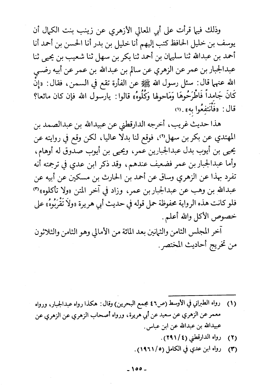 وذلك فيما قرأت على أبي المعالي الأزهري عن زينب بنت الكمال أن يوسف بن خليل الحافظ كتب إليهم أنا خليل بن بدر أنا الحسن بن أحمد أنا أحمد بن عبد اللَّه ثنا سليمان بن أحمد ثنا بكر بن سهل ثنا شعيب بن يحيى ثنا عبد الجبار بن عمر عن الزهري عن سالم بن عبد اللَّه بن عمر عن أبيه رضي اللَّه عنهما قال: سئل رسول اللَّه -صلى اللَّه عليه وسلم- عن الفأرة تقع في السمن، فقال: "إِنْ كَانَ جَامِدًا فَاطْرَحُوهَا وَمَا حولها وَكُلُوهُ" قالوا: يا رسول اللَّه فإن كان مائعا؟ قال: "فَانَتفِعُوا بِهِ". (¬1)