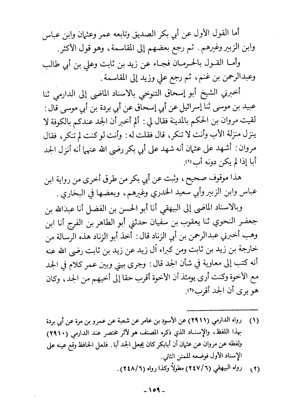 أخبرني الشيخ أبو إسحاق التنوخي بالإسناد الماضى إلى الدارمي ثنا عبيد بن موسى ثنا إسرائيل عن أبي إسحاق عن أبي بردة بن أبي موسى قال: لقيت مروان بن الحكم بالمدينة فقال لي: ألم أخبر أن الجد عندكم بالكوفة لا ينزل منزلة الأب وأنت لا تنكر، قال فقلت به: وأنت لو كنت لم تنكر، فقال مروان: أشهد على عثمان أنه شهد على أبي بكر رضي اللَّه عنهما أنه أنزل الجد أبا إذا لم يكن دونه أب (¬1).
