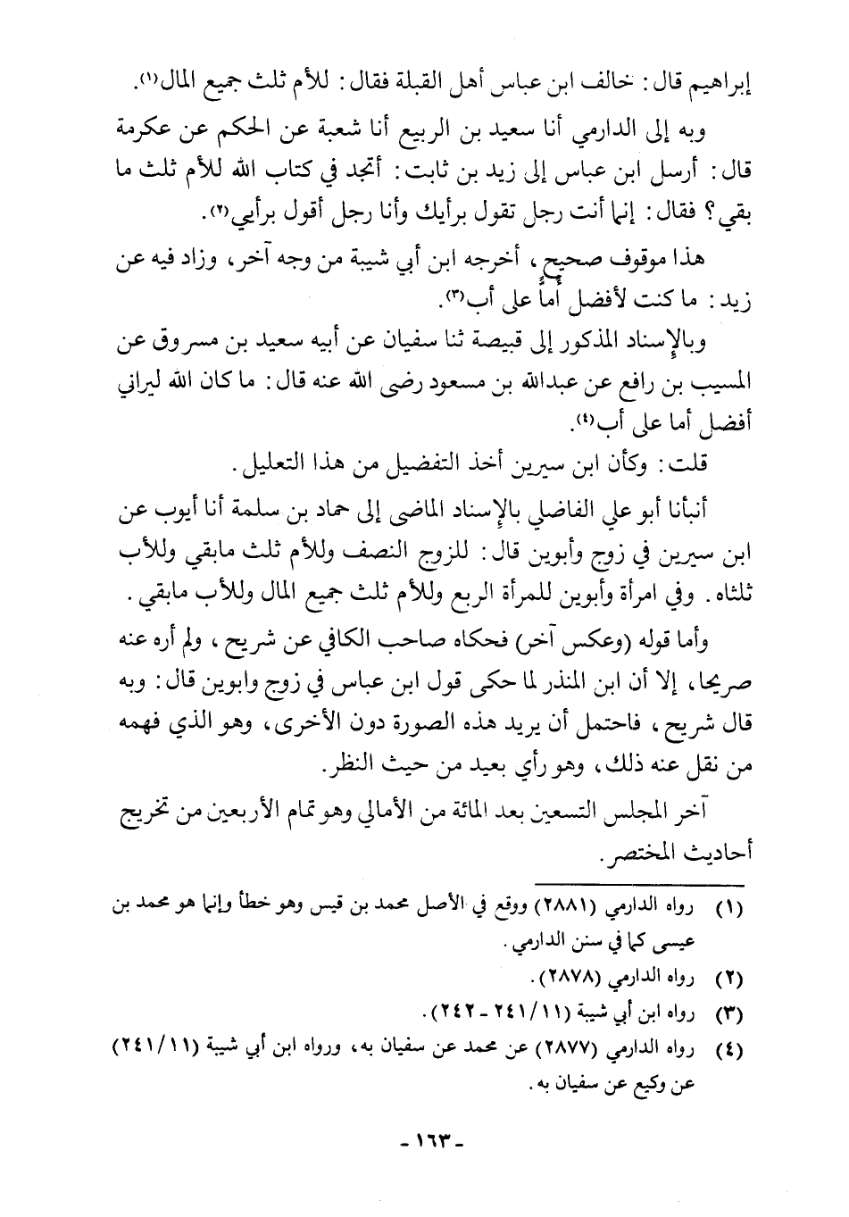 وبه إلى الدارمي أنا سعيد بن الربيع أنا شعبة عن الحكم عن عكرمة قال: أرسل ابن عباس إلى زيد بن ثابت: أتجد في كتاب اللَّه للأم ثلث ما بقي؟ فقال: إنما أنت رجار تقول برأيك وأنا رجل أقول برأيي (¬2).