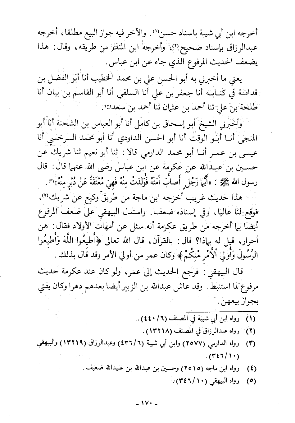 قال البيهقي: فرجع الحديث إلى عمر، ولو كان عند عكرمة حديث مرفوع لما استنبط. وقد عاش عبد اللَّه بن الزبير أيضا بعدهم دهرا وكان يفتي بجواز بيعهن.