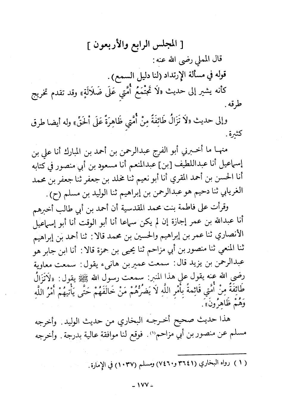 وإلى حديث "لَا تَزَالُ طَائِفَةٌ مِنْ أُمَّتي ظَاهِرَةً عَلَى الحَقِّ" وله أيضا طرق كثيرة.