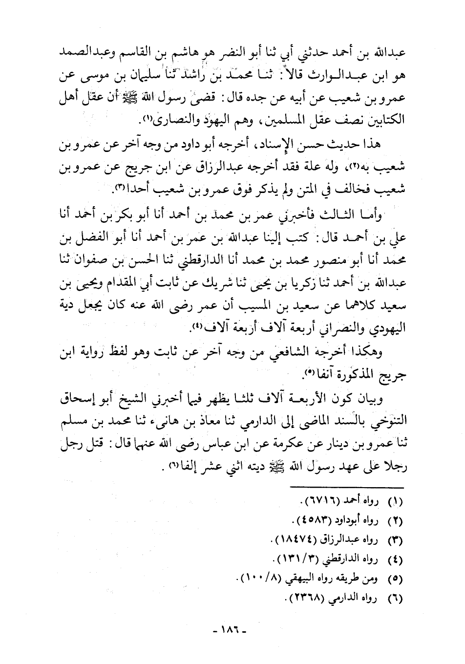 عبد اللَّه بن أحمد حدثني أبي ثنا أبو النضر هو هاشم بن القاسم وعبد الصمد هو ابن عبد الوارث قالا: ثنا محمد بن راشد ثنا سليمان بن موسى عن عمرو بن شعيب عن أبيه عن جده قال: قضى رسول اللَّه -صلى اللَّه عليه وسلم- أن عقل أهل الكتابين نصف عقل المسلمين، وهم اليهود والنصارى (¬1).
