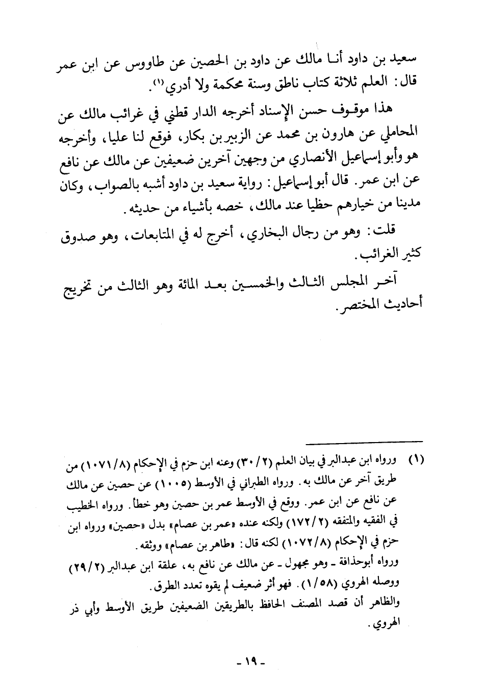 (¬1) ورواه ابن عبد البر في بيان العلم (2/ 30) وعنه ابن حزم في الإحكام (8/ 1071) من طريق آخر عن مالك به. ورواه الطبراني في الأوسط (1005) عن حصين عن مالك عن نافع عن ابن عمر. ووقع في الأوسط عمر بن حصين وهو خطأ. ورواه الخطيب في الفقيه والمتفقه (2/ 172) ولكنه عنده "عمر بن عصام" بدل "حصين" ورواه ابن حزم في الإحكام (8/ 1072) لكنه قال: "طاهر بن عصام" ووثقه.