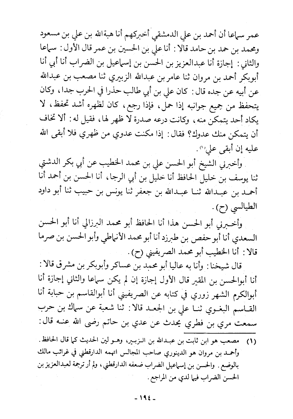 وأخبرني أبو الحسن هذا أنا الحافظ أبو محمد البرزالي أنا أبو الحسن السعدي أنا أبو حفص بن طبرزد أنا أبو محمد الأنماطي وأبو الحسن بن صرما قالا: أنا الخطيب أبو محمد الصريفيني (ح).