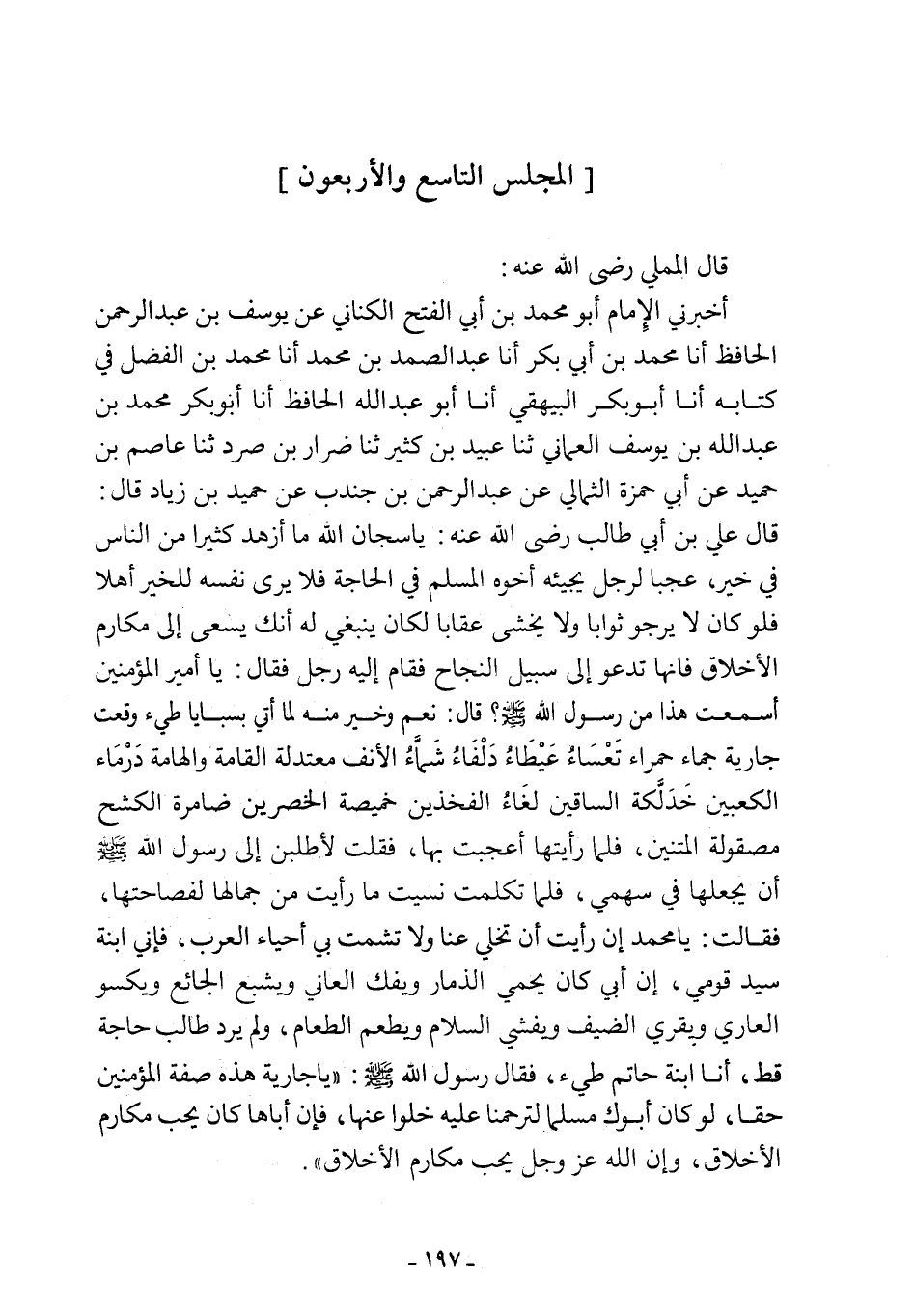 أخبرني الإِمام أبو محمد بن أبي الفتح الكناني عن يوسف بن عبد الرحمن الحافظ أنا محمد بن أبي بكر أنا عبد الصمد بن محمد أنا محمد بن الفضل في كتابه أنا أبو بكر البيهقي أنا أبو عبد اللَّه الحافظ أنا أبو بكر محمد بن عبد اللَّه بن يوسف العماني ثنا عبيد بن كثير ثنا ضرار بن صرد ثنا عاصم بن حميد عن أبي حمزة الثمالي عن عبد الرحمن بن جندب عن حميد بن زياد قال: قال علي بن أبي طالب رضي اللَّه عنه: يا سجان اللَّه ما أزهد كثيرا من الناس في خير، عجبا لرجل يجيئه أخوه المسلم في الحاجة فلا يرى نفسه للخير أهلا فلو كان لا يرجو ثوابا ولا يخشى عقابا لكان ينبغي له أنك يسعى إلى مكارم الأخلاق فانها تدعو إلى سبيل النجاح فقام إليه رجل فقال: يا أمير المؤمنين أسمعت هذا من رسول اللَّه -صلى اللَّه عليه وسلم-؟ قال: نعم وخير منه لما أتي بسبايا طيء وقعت جارية جماء حمراء تَعْسَاءُ عَيْطَاءُ دَلْفَاءُ شَمَّاء الأنف معتدلة القامة والهامة دَرْمَاء الكعبين خَدَلَّكة الساقين لغَاءُ الفخذين خميصة الخصرين ضامرة الكشح مصقولة المتنين، فلما رأيتها أعجبت بها، فقلت لأطلبن إلى رسول اللَّه -صلى اللَّه عليه وسلم- أن يجعلها في سهمي، فلما تكلمت نسيت ما رأيت من جمالها لفصاحتها، فقالت: يا محمد إن رأيت أن تخلي عنا ولا تشمت بي أحياء العرب، فإني ابنة سيد قومي، إن أبي كان يحمي الذمار ويفك العاني ويشبع الجائع ويكسو العاري ويقري الضيف ويفشي السلام ويطعم الطعام، ولم يرد طالب حاجة قط، أنا ابنة حاتم طيء، فقال رسول اللَّه -صلى اللَّه عليه وسلم-: "يا جارية هذه صفة المؤمنين حقا، لو كان أبوك مسلما لترحمنا عليه خلوا عنها، فإن أباها كان يحب مكارم الأخلاق، وإن اللَّه عز وجل يحب مكارم الأخلاق".
