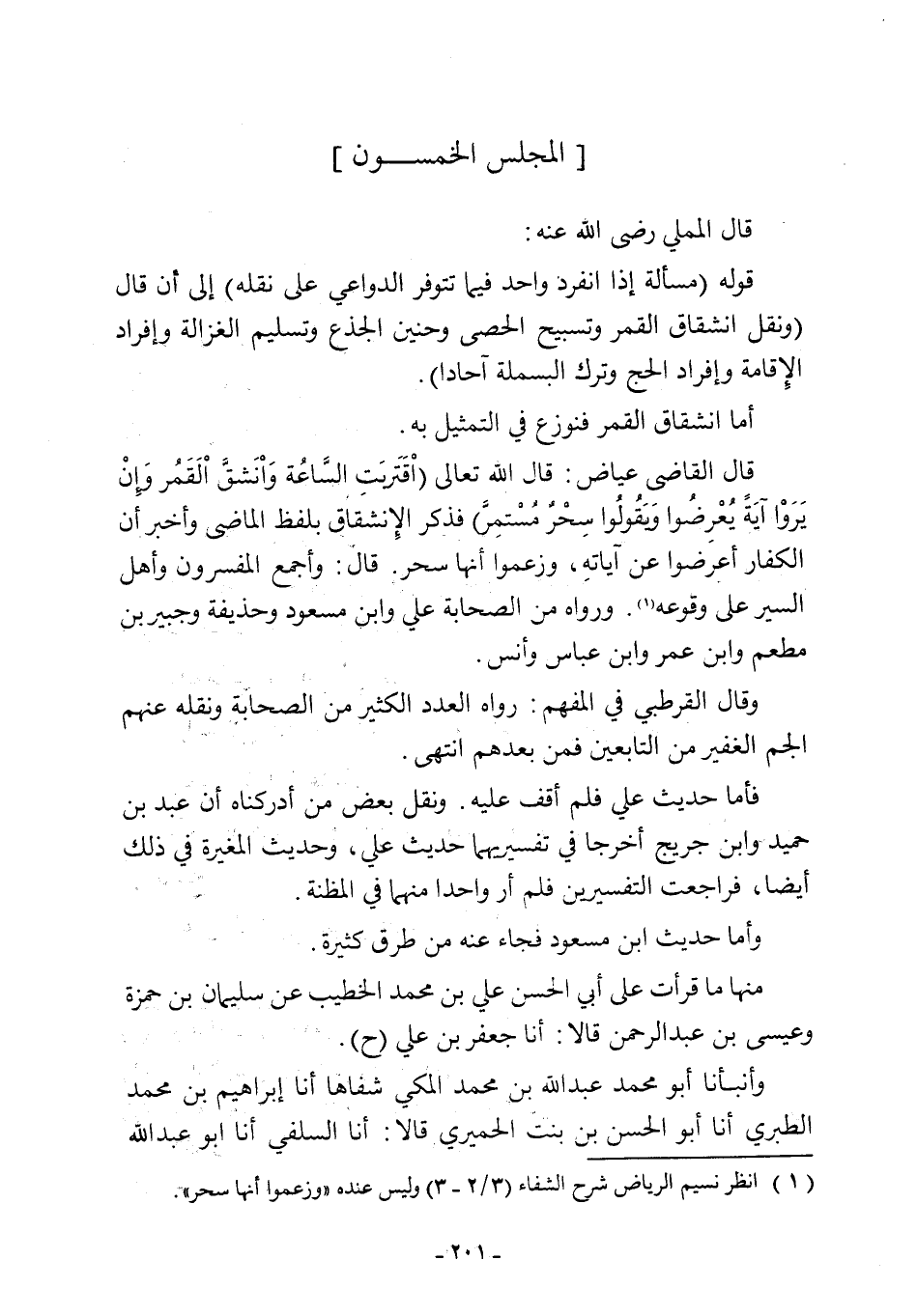 قال القاضى عياض: قال اللَّه تعالى {اقْتَرَبَتِ السَّاعَةُ وَانْشَقَّ الْقَمَرُ (1) وَإِنْ يَرَوْا آيَةً يُعْرِضُوا وَيَقُولُوا سِحْرٌ مُسْتَمِرٌّ (2)} فذكر الإنشقاق بلفظ الماضى وأخبر أن الكفار أعرضوا عن آياته، وزعموا أنها سحر. قال: وأجمع المفسرون وأهل السير على وقوعه (¬1). ورواه من الصحابة على وابن مسعود وحذيفة وجبير بن مطعم وابن عمر وابن عباس وأنس.