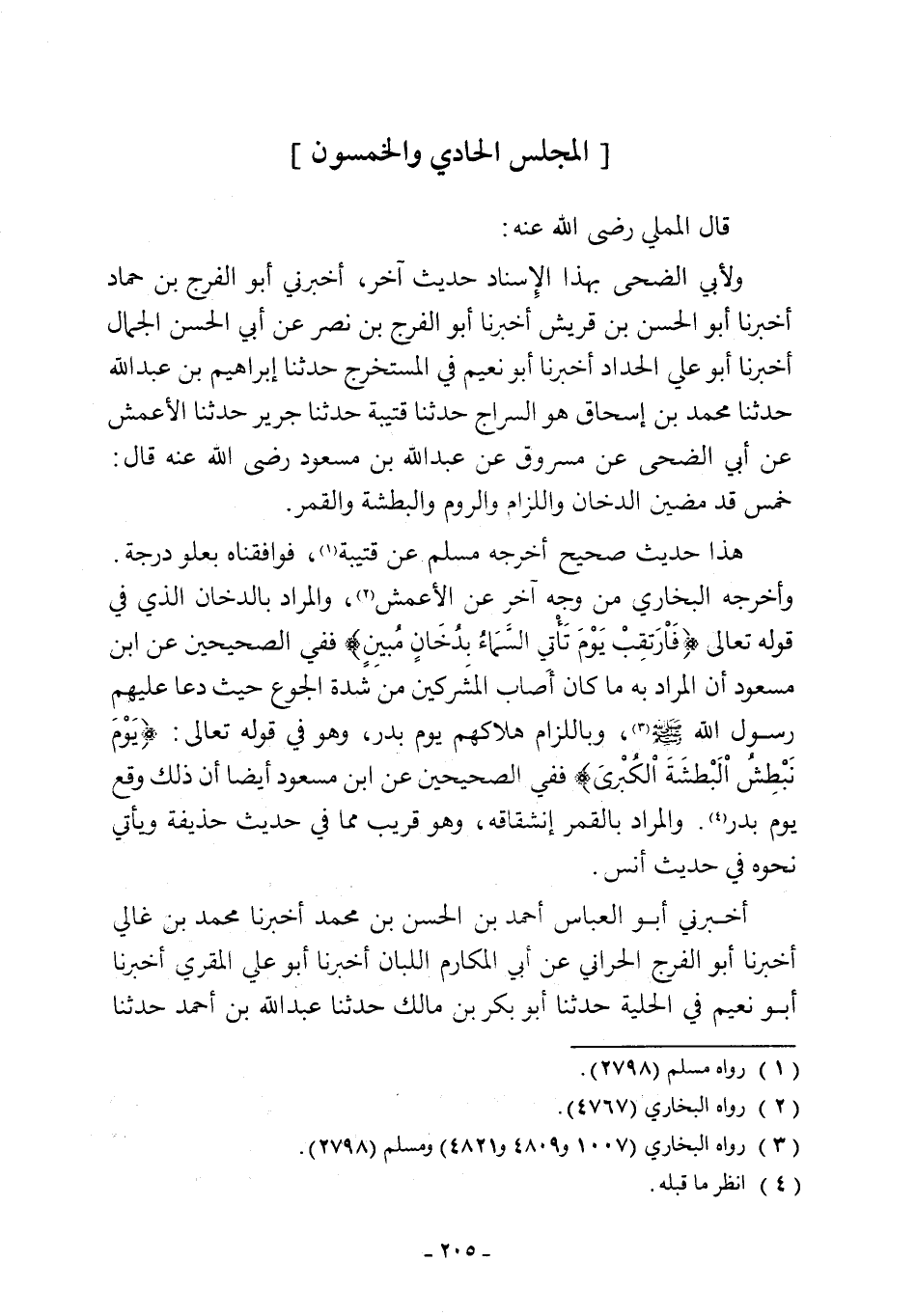 ولأبي الضحى بهذا الإسناد حديث آخر، أخبرني أبو الفرج بن حماد أخبرنا أبو الحسن بن قريش أخبرنا أبو الفرج بن نصر عن أبي الحسن الجمال أخبرنا أبو علي الحداد أخبرنا أبو نعيم في المستخرج حدثنا إبراهيم بن عبد اللَّه حدثنا محمد بن إسحاق هو السراج حدثنا قتيبة حدثنا جرير حدثنا الأعمش عن أبي الضحى عن مسروق عن عبد اللَّه بن مسعود رضي اللَّه عنه قال: خمس قد مضين الدخان واللزام والروم والبطشة والقمر.