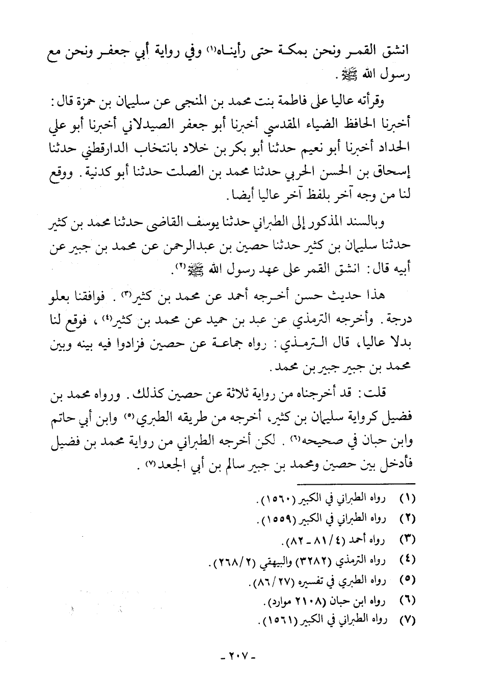 وبالسند المذكور إلى الطبراني حدثنا يوسف القاضى حدثنا محمد بن كثير حدثنا سليمان بن كثير حدثنا حصين بن عبد الرحمن عن محمد بن جبير عن أبيه قال: انشق القمر على عهد رسول اللَّه -صلى اللَّه عليه وسلم- (¬2).