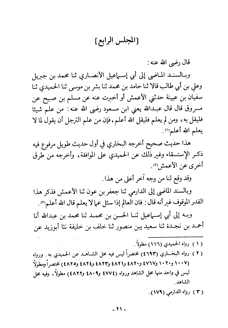 وبالسند الماضى إلى أبي إسماعيل الأنصاري ثنا محمد بن جبريل وعلي بن أبي طالب قالا ثنا حامد بن محمد ثنا بشر بن موسى ثنا الحميدي ثنا سفيان بن عيينة حدثني الأعمش أو أخبرت عنه عن مسلم بن صبيح عن مسروق قال قال عبد اللَّه يعني ابن مسعود رضي اللَّه عنه: من علم شيئا فليقل به، ومن لم يعلم فليقل اللَّه أعلم، فإن من علم الترجل أن يقول لما لا يعلم اللَّه أعلم (¬1).