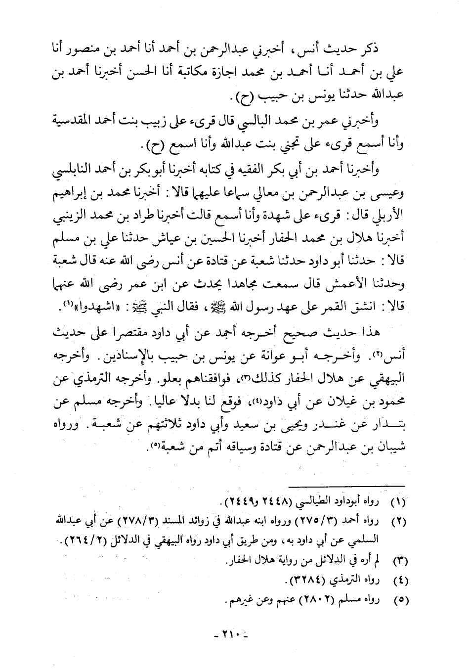 وأخبرنا أحمد بن أبي بكر الفقيه في كتابه أخبرنا أبو بكر بن أحمد النابلسي عيسى عبد الرحمن بن معالِى سماعا عليهما قالا: أخبرنا محمد بن إبراهيم الأربلي قال: قرئ على شهدة وأنا أسمع قالت أخبرنا طراد بن محمد الزينبي أخبرنا هلال بن محمد الحفار أخبرنا الحسين بن عياش حدثنا علي بن مسلم قالا: حدثنا أبو داود حدثنا شعبة عن قتادة عن أنس رضي اللَّه عنه قال شعبة وحدثنا الأعمش قال سمعت مجاهدا يحدث عن ابن عمر رضي اللَّه عنهما قالا: انشق القمر على عهد رسول اللَّه -صلى اللَّه عليه وسلم-، فقال النبي -صلى اللَّه عليه وسلم-: "اشهدوا" (¬1).