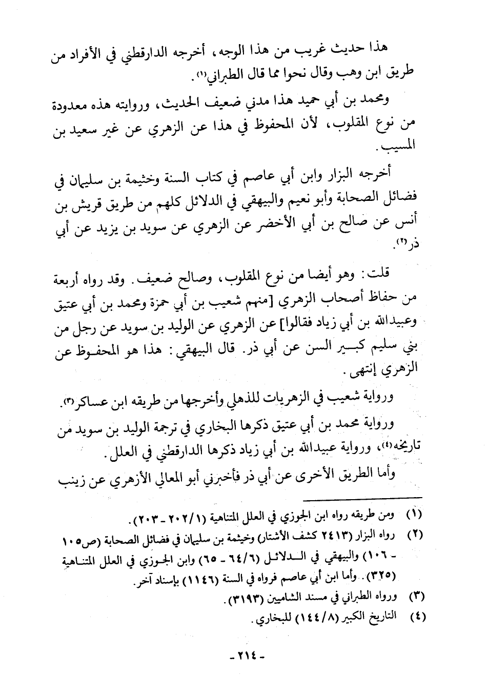 قلت: وهو أيضا من نوع المقلوب، وصالح ضعيف. وقد رواه أربعة من حفاظ أصحاب الزهري [منهم شعيب بن أبي حمزة ومحمد بن أبي عتيق وعبيد اللَّه بن أبي زياد فقالوا] عن الزهري عن الوليد بن سويد عن رجل من بني سليم كبير السن عن أبي ذر. قال البيهقي: هذا هو المحفوظ عن الزهري إنتهى.