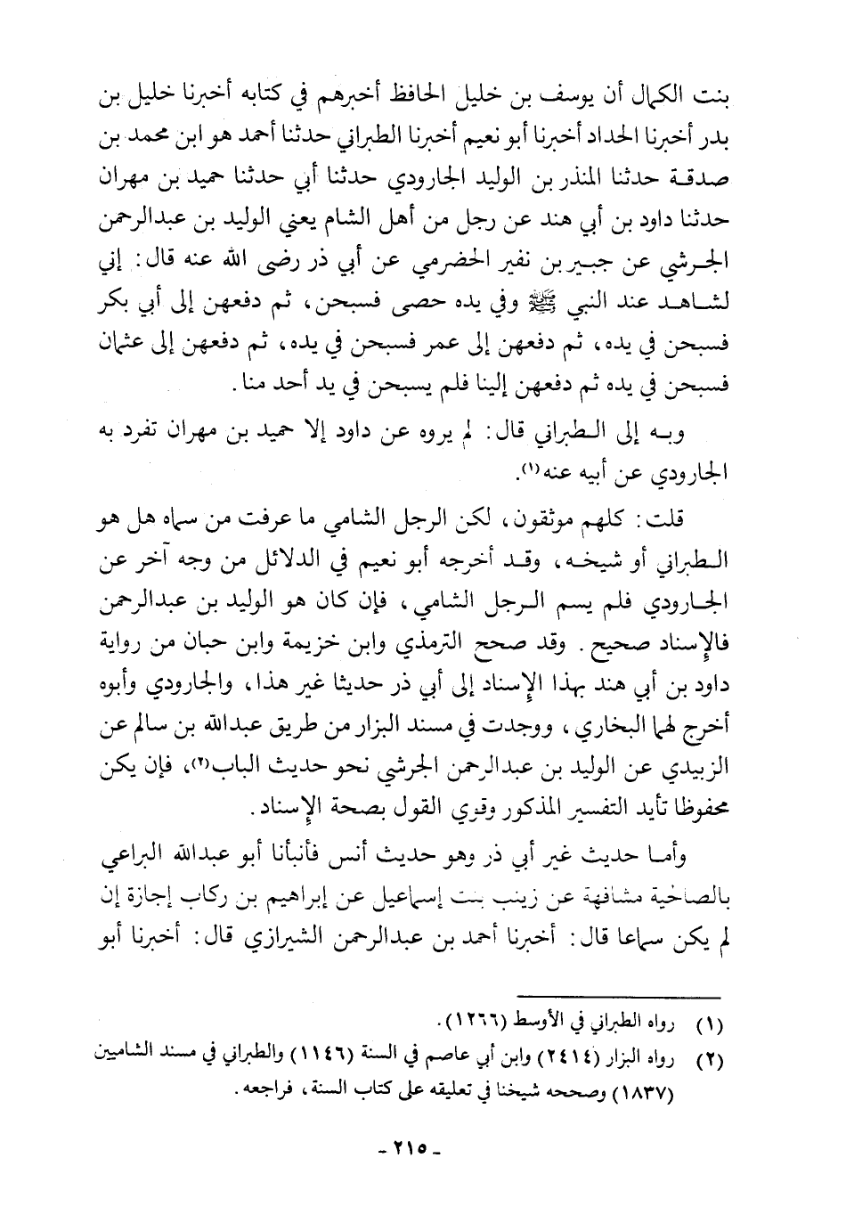 بنت الكمال أن يوسف بن خليل الحافظ أخبرهم في كتابه أخبرنا خليل بن بدر أخبرنا الحداد أخبرنا أبو نعيم أخبرنا الطبراني حدثنا أحمد هو ابن محمد بن صدقة حدثنا المنذر بن الوليد الجارودي حدثنا أبي حدثنا حميد بن مهران حدثنا داود بن أبي هند عن رجل من أهل الشام يعني الوليد بن عبد الرحمن الجرشي عن جبير بن نفير الحضرمي عن أبي ذر رضي اللَّه عنه قال: إني لشاهد عند النبي -صلى اللَّه عليه وسلم- وفي يده حصى فسبحن، ثم دفعهن إلى أبي بكر فسبحن في يده، ثم دفعهن إلى عمر فسبحن في يده، ثم دفعهن إلى عثمان فسبحن في يده ثم دفعهن إلينا فلم يسبحن في يد أحد منا.