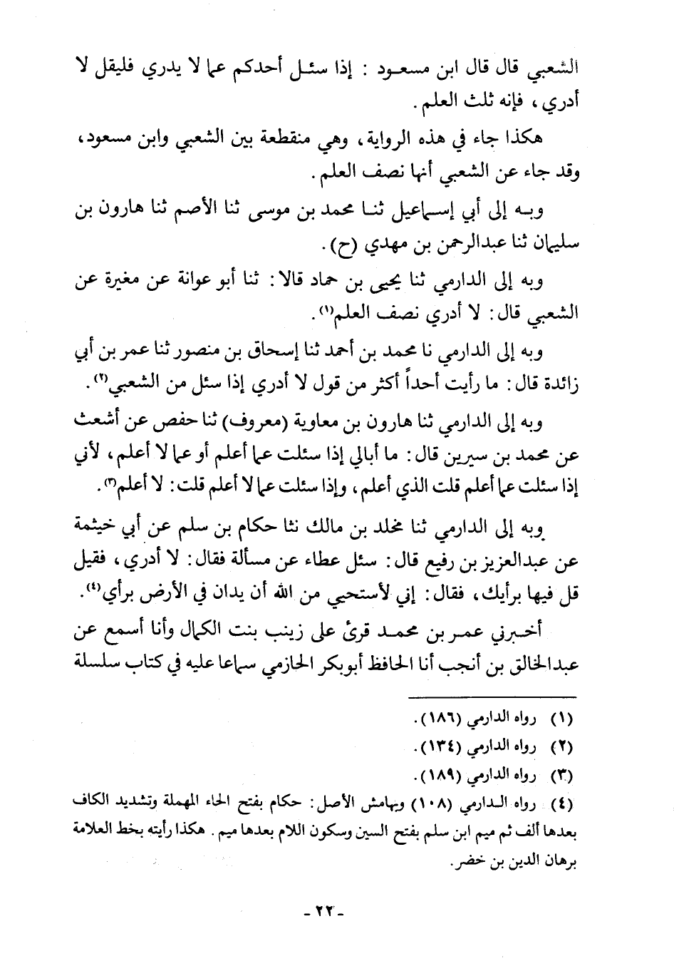 (¬4) رواه الدارمي (108) وبهامش الأصل: حكام بفتح الحاء المهملة وتشديد الكاف بعدها ألف ثم ميم ابن سلم بفتح السين وسكون اللام بعدها ميم. هكذا رأيته بخط العلامة برهان الدين بن خضر.
