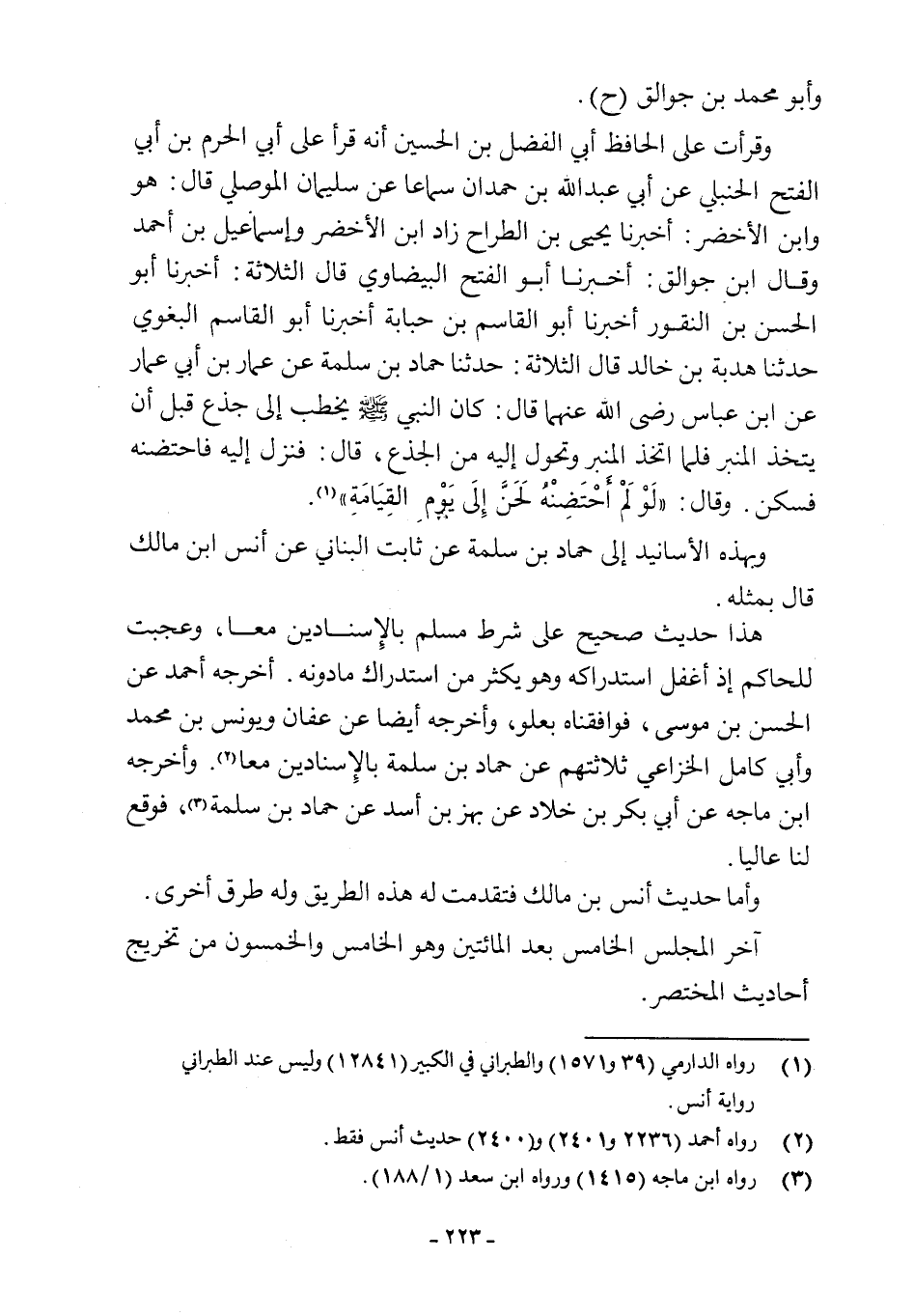 وقرأت على الحافظ أبي الفضل بن الحسين أنه قرأ على أبي الحرم بن أبي الفتح الحنبلي عن أبي عبد اللَّه بن حمدان سماعا عن سليمان الموصلي قال: هو وابن الأخضر: أخبرنا يحيى بن الطراح زاد ابن الأخضر وإسماعيل بن أحمد وقال ابن جوالق: أخبرنا أبو الفتح البيضاوي قال الثلاثة: أخبرنا أبو الحسن بن النقور أخبرنا أبو القاسم بن حبابة أخبرنا أبو القاسم البغوي حدثنا هدبة بن خالد قال الثلاثة: حدثنا حماد بن سلمة عن عمار بن أبي عمار عن ابن عباس رضي اللَّه عنهما قال: كان النبي -صلى اللَّه عليه وسلم- يخطب إلى جذع قبل أن يتخذ المنبر فلما اتخذ المنبر وتحول إليه من الجذع، قال: فنزل إليه فاحتضنه فسكن. وقال: "لَوْ لَمْ أَحْتَضِنْهُ لَحَنَّ إِلَى يَوْمِ القِيَامةِ" (¬1).
