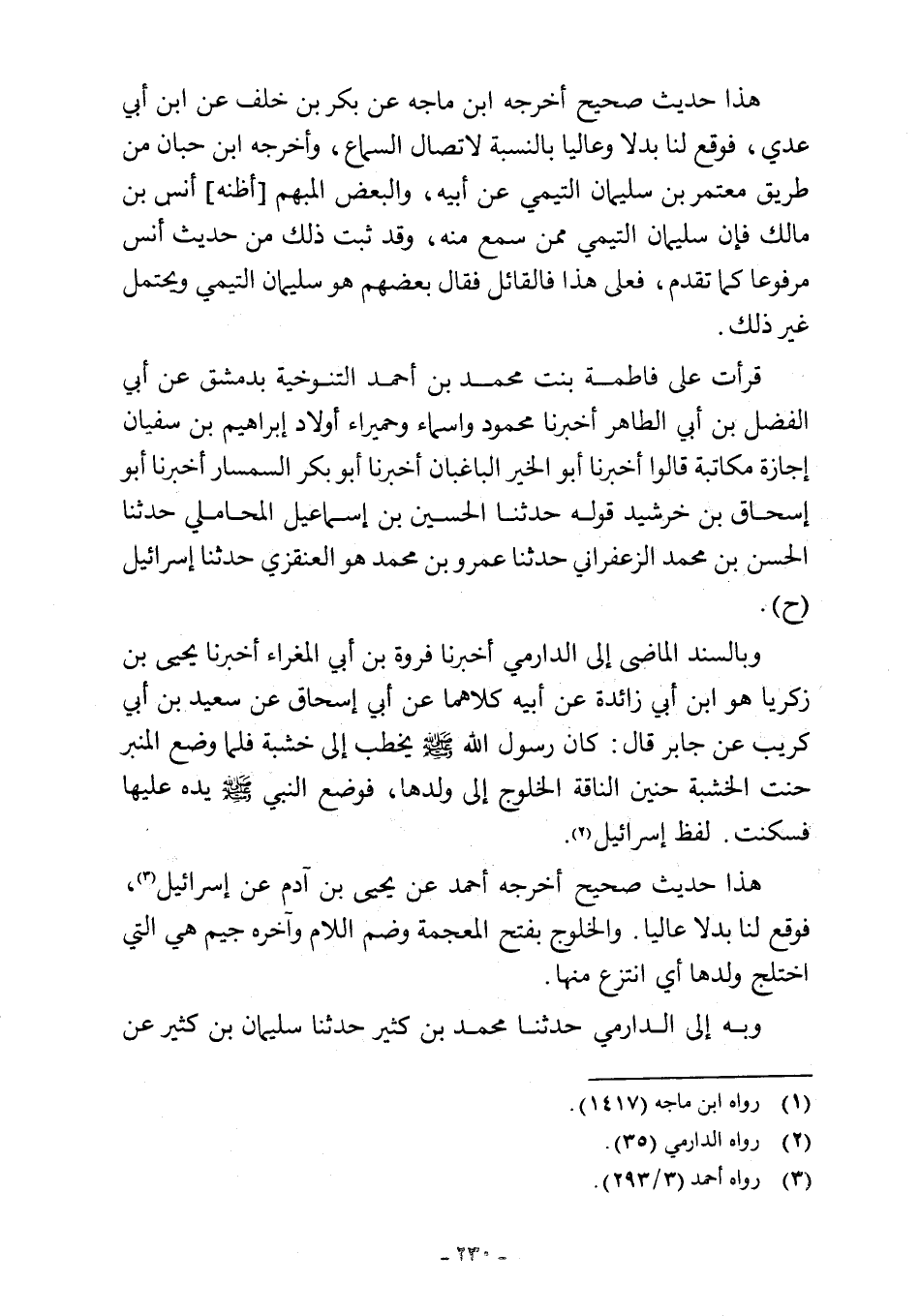 قرأت على فاطمة بنت محمد بن أحمد التنوخية بدمشق عن أبي الفضل بن أبي الطاهر أخبرنا محمود واسماء وحميراء أولاد إبراهيم بن سفيان إجازة مكاتبة قالوا أخبرنا أبو الخير الباغبان أخبرنا أبو بكر السمسار أخبرنا أبو إسحاق بن خرشيد قوله حدثنا الحسين بن إسماعيل المحاملي حدثنا الحسن بن محمد الزعفراني حدثنا عمرو بن محمد هو العنقزي حدثنا إسرائيل (ح). (¬1)