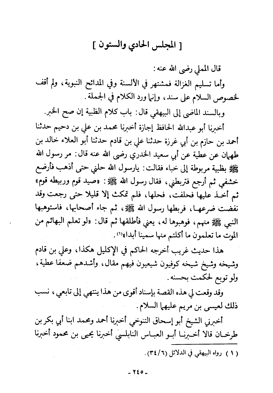 أخبرنا أبو عبد اللَّه الحافظ إجازة أخبرنا محمد بن علي بن دحيم حدثنا أحمد بن حازم بن أبي غرزة حدثنا علي بن قادم حدثنا أبو العلاء خالد بن طهمان عن عطية عن أبي سعيد الخدري رضي اللَّه عنه قال: رسول اللَّه -صلى اللَّه عليه وسلم- بظبية مربوطة إلى خباء فقالت: يا رسول اللَّه حلني حتى أذهب فأرضع خشفي ثم أرجع فتربطني، فقال رسول اللَّه -صلى اللَّه عليه وسلم-: "صيد قوم وربيطه قوم" ثم أخذ عليها فحلفت، فحلها، فلم تمكث إلا قليلا حتى رجعت وقد نفضت ضرعها، فربطها رسول اللَّه -صلى اللَّه عليه وسلم-، ثم جاء أصحابها، فاستوهبها النبي -صلى اللَّه عليه وسلم- منهم، فوهبوها له، يعني فأطلقها ثم قال: "لو تعلم البهائم من الموت ما تعلمون ما أكلتم منها سمينا أبدا" (¬1).
