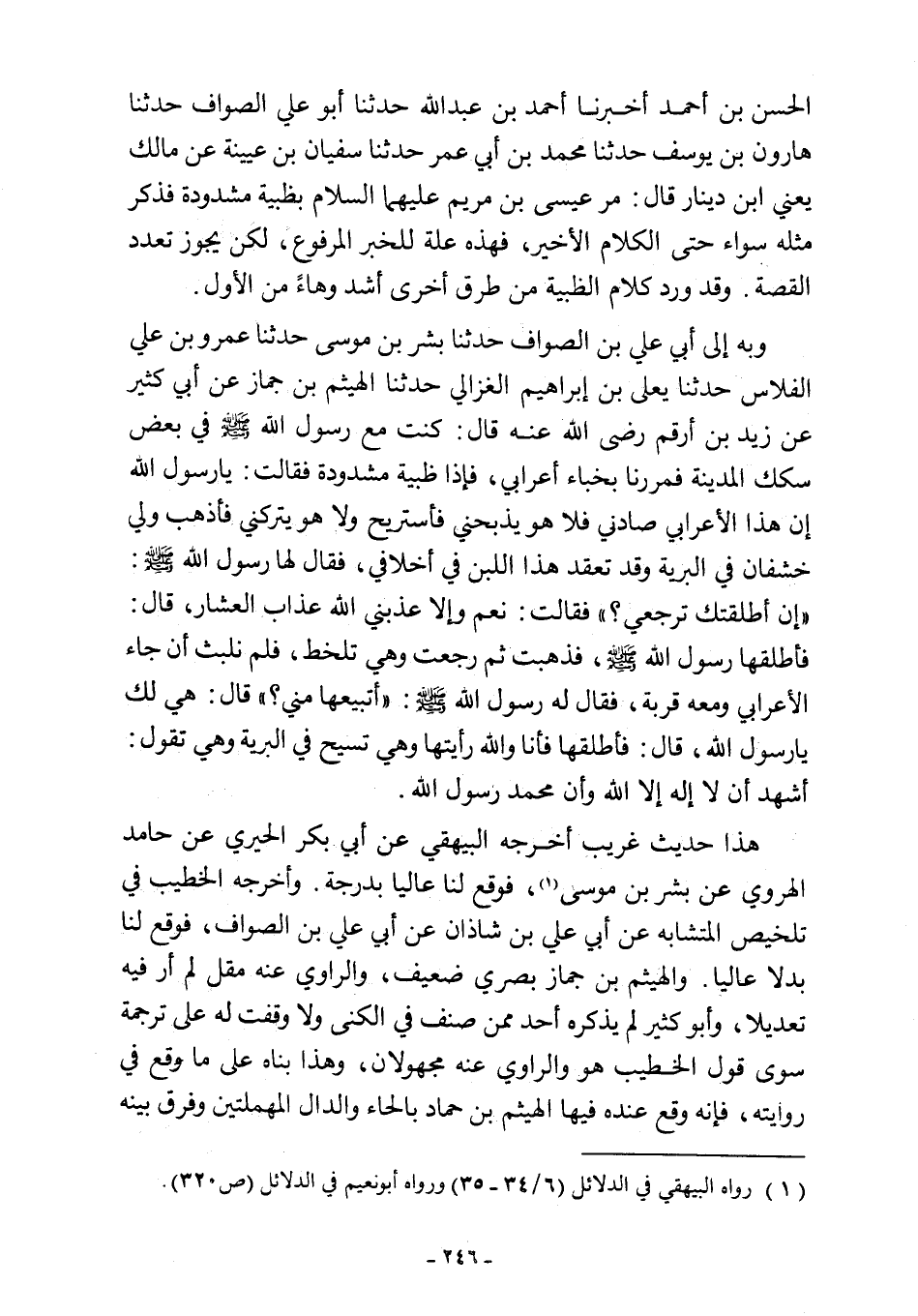 الحسن بن أحمد أخبرنا أحمد بن عبد اللَّه حدثنا أبو علي الصواف حدثنا هارون بن يوسف حدثنا محمد بن أبي عمر حدثنا سفيان بن عيينة عن مالك يعني ابن دينار قال: عيسى بن مريم عليهما السلام بظبية مشدودة فذكر مثله سواء حتى الكلام الأخير، فهذه علة للخبر المرفوع، لكن يجوز تعدد القصة. وقد ورد كلام الظبية من طرق أخرى أشد وهاءً من الأول.