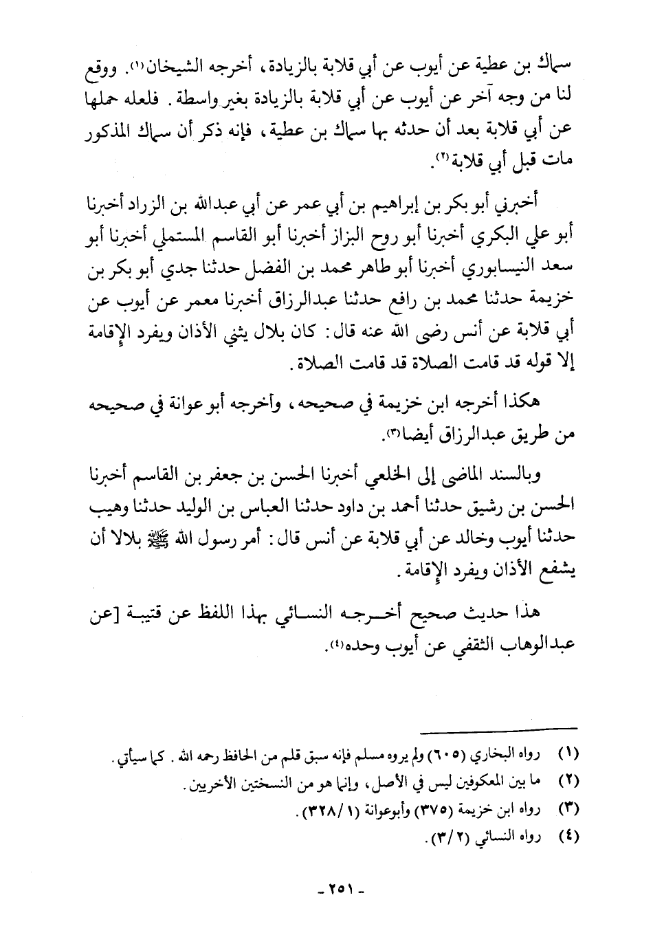 أخبرني أبو بكر بن إبراهيم بن أبي عمر عن أبي عبد اللَّه بن الزراد أخبرنا أبو علي البكري أخبرنا أبو روح البزاز أخبرنا أبو القاسم المستملي أخبرنا أبو سعد النيسابوري أخبرنا أبو طاهر محمد بن الفضل حدثنا جدي أبو بكر بن خزيمة حدثنا محمد بن رافع حدثنا عبد الرزاق أخبرنا معمر عن أيوب عن أبي قلابة عن أنس رضي اللَّه عنه قال: كان بلال يثني الأذان ويفرد الإقامة إلا قولى قد قامت الصلاة قد قامت الصلاة.