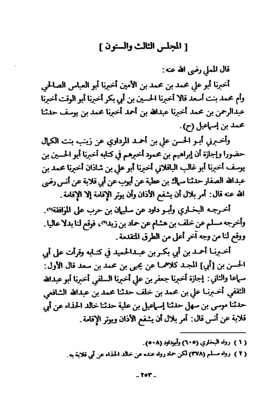 أخبرنا أحمد بن أبي بكر بن عبد الحميد فى كتابه وقرأت على أبي الحسن بن [أبي] المجد كلاهما عن يحيى بن محمد بن سعد قال الأول: سماعا والثاني: إجازة أخبرنا جعفر بن علي أخبرنا السلفي أخبرنا أبو عبد اللَّه الثقفي أخبرنا علي بن محمد بن خلف حدثنا محمد بن عبد اللَّه الشافعي حدثنا موسى بن سهل حدثنا إسماعيل بن علية حدثنا خالد الحذاء عن أبي قلابة عن أنس قال: أمر بلال أن يشفع الأذان ويوتر الإقامة.