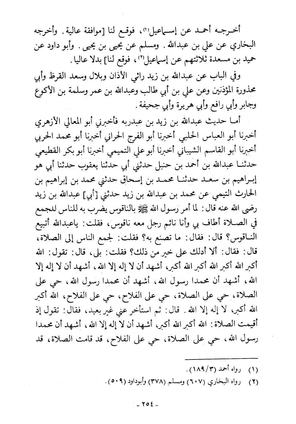 أما حديث عبد اللَّه بن زيد بن عبدربه فأخبرني أبو المعالي الأزهري أخبرنا أبو العباس الحلبي أخبرنا أبو الفرج الحراني أخبرنا أبو محمد الحربي أخبرنا أبو القاسم الشيباني أخبرنا أبو علي التميمي أخبرنا أبو بكر القطيعي حدثنا عبد اللَّه بن أحمد بن حنبل حدثني أبي حدثنا يعقوب حدثنا أبي هو إبراهيم بن سعد حدثنا محمد بن إسحاق حدثني محمد بن إبراهيم بن الحارث التيمي عن محمد بن عبد اللَّه بن زيد حدثني [أبي] عبد اللَّه بن زيد رضي اللَّه عنه قال: لما أمر رسول اللَّه -صلى اللَّه عليه وسلم- بالناقوس يضرب به للناس للجمع في الصلاة أطاف بي وأنا نائم رجل معه ناقوس، فقلت: يا عبد اللَّه أتبيع الناقوس؟ قال: فقال: ما تصنع به؟ فقلت: لجمع الناس إلى الصلاة، قال: فقال: ألا أدلك على خير من ذلك؟ فقلت: بلى، قال: تقول: اللَّه أكبر اللَّه أكبر اللَّه أكبر اللَّه أكبر، أشهد أن لا إله إلا اللَّه، أشهد أن لا إله إلا اللَّه، أشهد أن محمدا رسول اللَّه، أشهد أن محمدا رسول اللَّه، حي على الصلاة، حي على الصلاة، حي على الفلاح، حي علي الفلاح، اللَّه أكبر اللَّه أكبر، لا إله إلا اللَّه. قال: ثم استأخر عني غير بعيد، فقال: تقول إذ أقيمت الصلاة: اللَّه أكبر اللَّه أكبر، أشهد أن لا إله إلا اللَّه، أشهد أن محمدا رسول اللَّه، حي على الصلاة، حي على الفلاح، قد قامت الصلاة، قد
