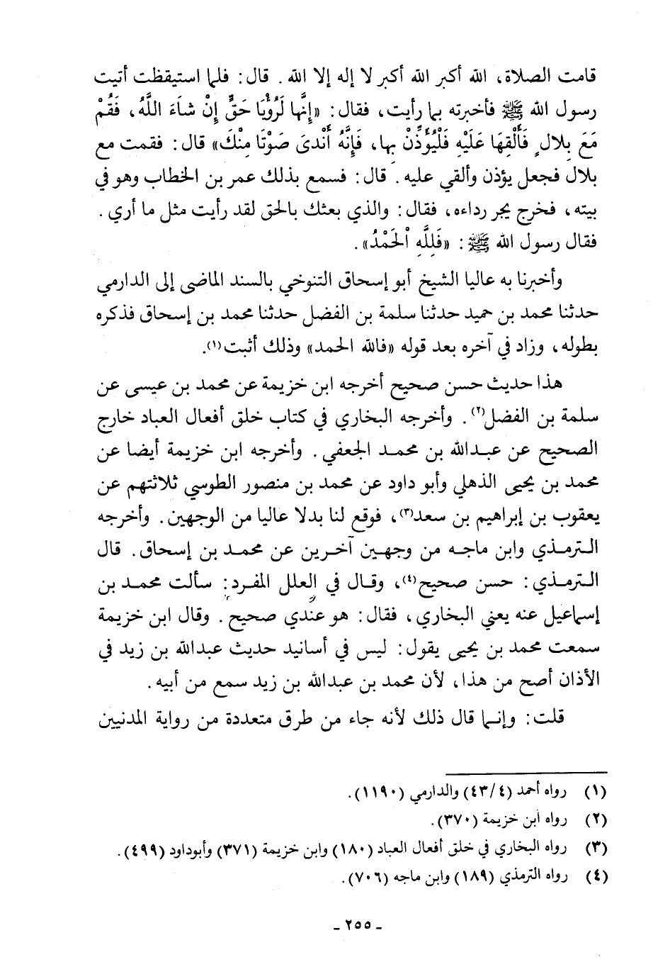 هذا حديث حسن صحيح أخرجه ابن خزيمة عن محمد بن عيسى عن سلمة بن الفضل (¬2). وأخرجه البخاري في كتاب خلق أفعال العباد خارج الصحيح عن عبد اللَّه بن محمد الجعفي. وأخرجه ابن خزيمة أيضا عن محمد بن يحيى الذهلي وأبو داود عن محمد بن منصور الطوسي ثلاثتهم عن يعقوب بن إبراهيم بن سعد (¬3)، فوقع لنا بدلا عاليا من الوجهين. وأخرجه الترمذي وابن ماجه من وجهين آخرين عن محمد بن إسحاق. قال الترمذي: حسن صحيح (¬4)، وقال في العلل المفرد: سألت محمد بن إسماعيل عنه يعني البخاري، فقال: هو عندي صحيح. وقال ابن خزيمة سمعت محمد بن يحيى يقول: ليس في أسانيد حديث عبد اللَّه بن زيد في الأذان أصح من هذا، لأن محمد بن عبد اللَّه بن زيد سمع من أبيه.
