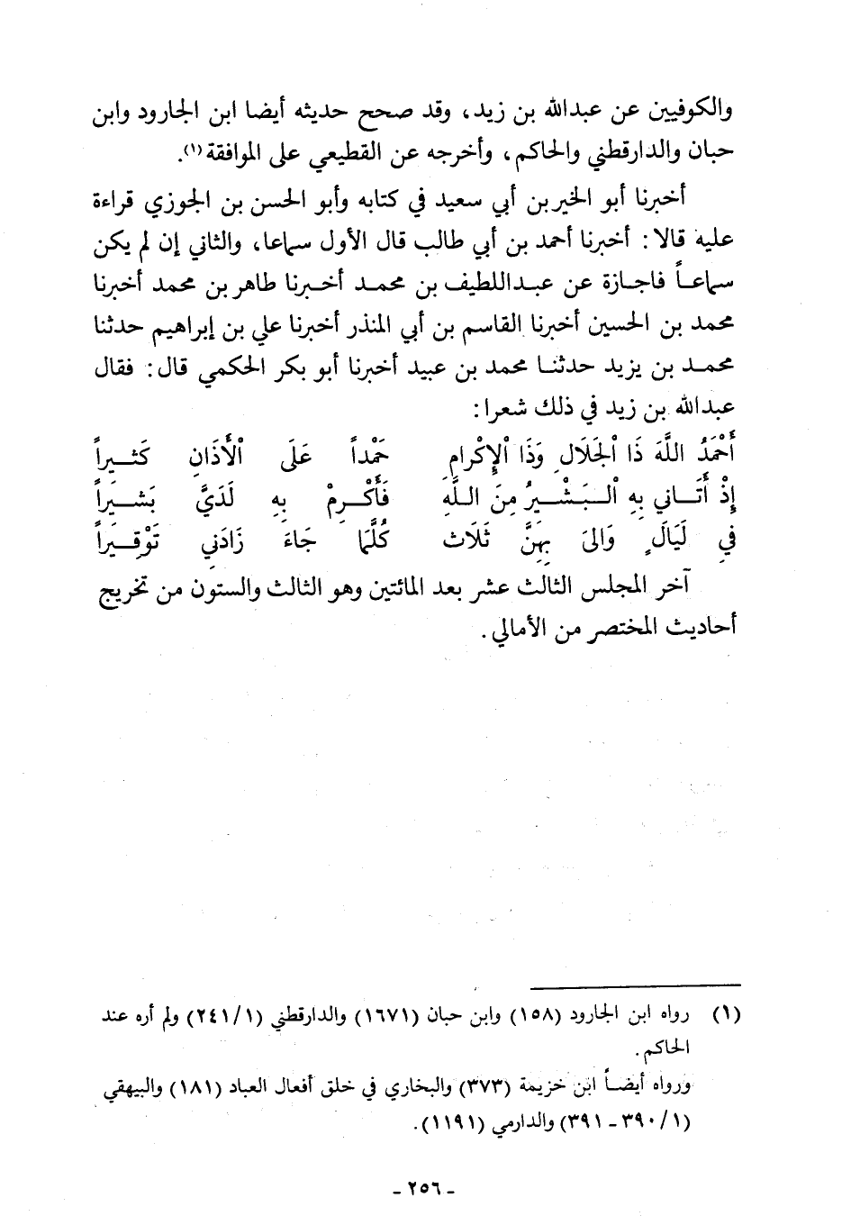 أخبرنا أبو الخير بن أبي سعيد في كتابه وأبو الحسن بن الجوزي قراءة علية قالا: أخبرنا أحمد بن أبي طالب قال الأول سماعا، والثاني إن لم يكن سماعًا فاجازة عن عبد اللطيف بن محمد أخبرنا طاهر بن محمد أخبرنا محمد بن الحسين أخبرنا القاسم بن أبي المنذر أخبرنا علي بن إبراهيم حدثنا محمد بن يزيد حدثنا محمد بن عبيد أخبرنا أبو بكر الحكمي قال: فقال عبد اللَّه بن زيد في ذلك شعرا: