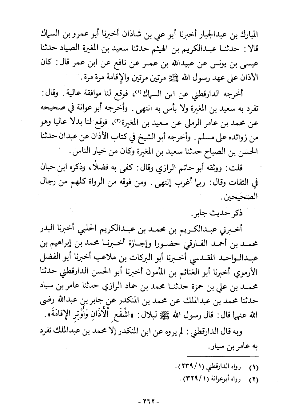 أخبرني عبد الكريم بن محمد بن عبد الكريم الحلبي أخبرنا البدر محمد بن أحمد الفارقي حضورا وإجازة أخبرنا محمد بن إبراهيم بن عبد الواحد المقدسي أخبرنا أبو البركات بن ملاعب أخبرنا أبو الفضل الأرموي أخبرنا أبو الغنائم بن المأمون أخبرنا أبو الحسن الدارقطني حدثنا محمد بن علي بن حمزة حدثنا محمد بن حماد الرازي حدثنا عامر بن سياد حدثنا محمد بن عبد الملك عن محمد بن المنكدر عن جابر بن عبد اللَّه رضي اللَّه عنهما قال: قال رسول اللَّه -صلى اللَّه عليه وسلم- لبلال: "اشْفَعِ الأذَانِ وَأَوْتِرِ الإِقَامَةَ".