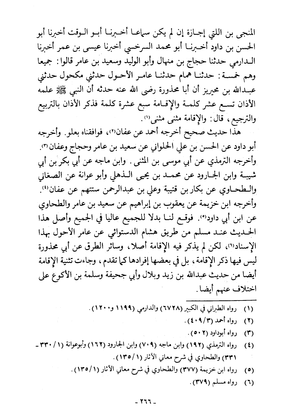 المنجى بن اللتي إجازة إن لم يكن سماعا أخبرنا أبو الوقت أخبرنا أبو الحسن بن داود أخبرنا أبو محمد السرخسي أخبرنا عيسى بن عمر أخبرنا الدارمي حدثنا حجاج بن منهال وأبو الوليد وسعيد بن عامر قالوا: جميعا وهم خمسة: حدثنا همام حدثنا عامر الأحول حدثني مكحول حدثني عبد اللَّه بن محيريز أن أبا محذورة رضي اللَّه عنه حدثه أن النبي -صلى اللَّه عليه وسلم- علمه الأذان تسع عشر كلمة والإقامة سبع عشرة كلمة فذكر الأذان بالتربيع والترجع، قال: والإقامة مثنى مثنى (¬1).