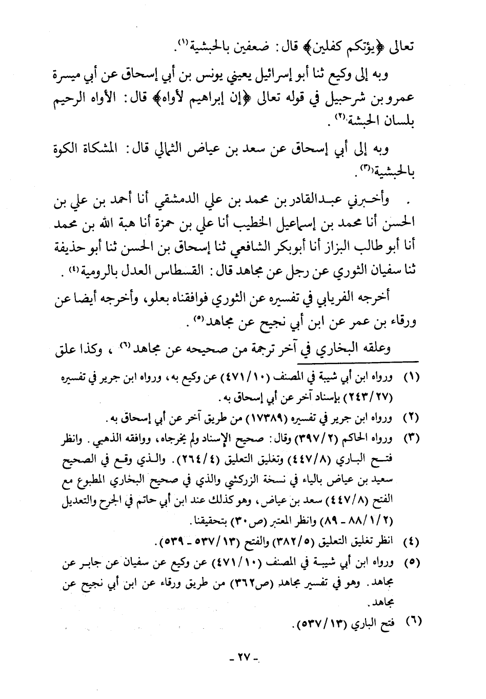 وأخبرني عبد القادر بن محمد بن علي الدمشقي أنا أحمد بن علي بن الحسن أنا محمد بن إسماعيل الخطيب أنا علي بن حمزة أنا هبة اللَّه بن محمد أنا أبو طالب البزاز أنا أبو بكر الشافعي ثنا إسحاق بن الحسن ثنا أبو حذيفة ثنا سفيان الثوري عن رجل عن مجاهد قال: القسطاس العدل بالرومية (¬4).