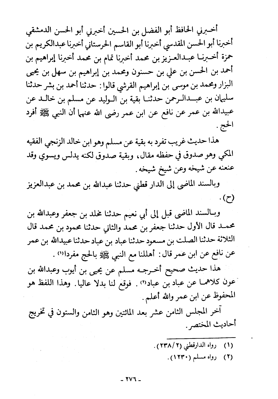 أخبرني الحافظ أبو الفضل بن الحسن أخبرني أبو الحسن الدمشقي أخبرنا أبو الحسن المقدسي أخبرنا أبو القاسم الحرستاني أخبرنا عبد الكريم بن حمزة أخبرنا عبد العزيز بن محمد أخبرنا تمام بن محمد أخبرنا إبراهيم بن أحمد بن الحسن بن علي بن حسنون ومحمد بن إبراهيم بن سهل بن يحيى البزار ومحمد بن موسى بن إبراهيم القرشي قالوا: حدثنا أحمد بن بشر حدثنا سليمان بن عبد الرحمن حدثنا بقية بن الوليد عن مسلم بن خالد عن عبيد اللَّه بن عمر عن نافع عن ابن عمر رضي اللَّه عنهما أن النبي -صلى اللَّه عليه وسلم- أفرد الحج.