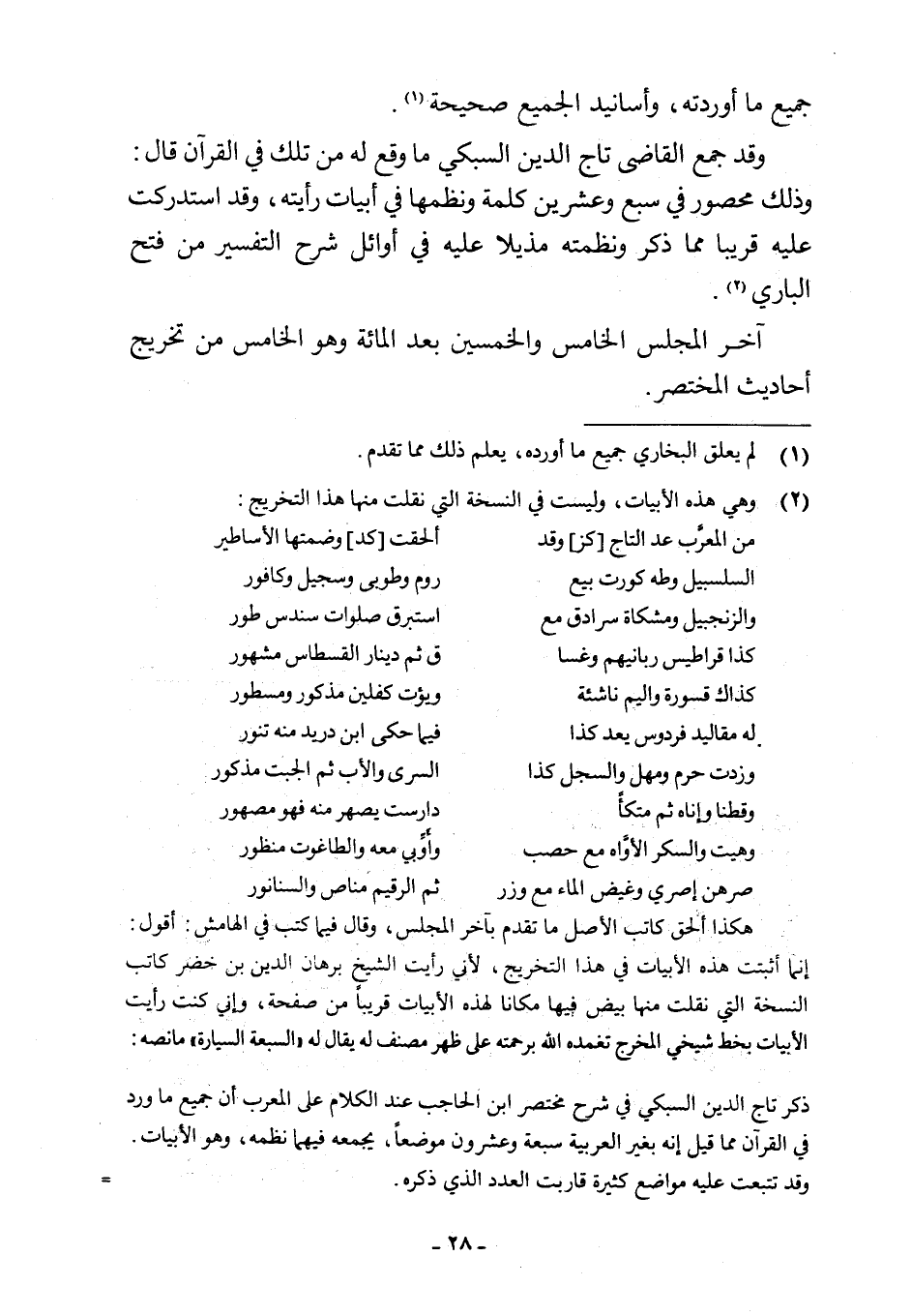 وقد جمع القاضى تاج الدين السبكي ما وقع له من تلك في القرآن قال: وذلك محصور في سبع وعشرين كلمة ونظمها في أبيات رأيته، وقد استدركت عليه قريبا مما ذكر ونظمته مذيلا عليه في أوائل شرح التفسير من فتح الباري (¬2).
