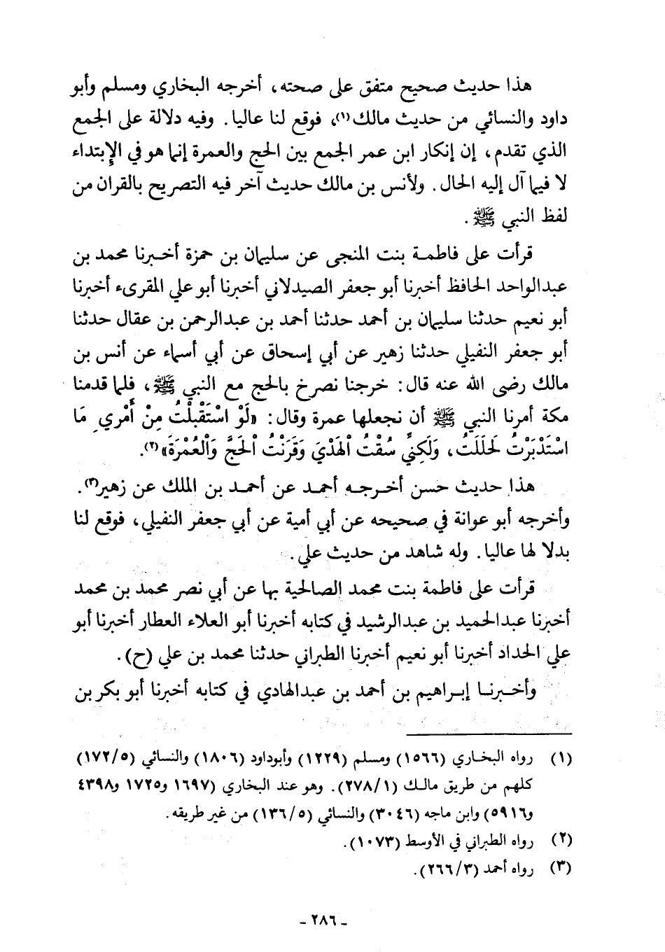 قرأت على فاطمة بنت المنجى عن سليمان بن حمزة أخبرنا محمد بن عبد الواحد الحافظ أخبرنا أبو جعفر الصيدلاني أخبرنا أبو علي المقرئ أخبرنا أبو نعيم حدثنا سليمان بن أحمد حدثنا أحمد بن عبد الرحمن بن عقال حدثنا أبو جعفر النفيلي حدثنا زهير عن أبي إسحاق عن أبي أسماء عن أنس بن مالك رضي اللَّه عنه قال: خرجنا نصرخ بالحج مع النبي -صلى اللَّه عليه وسلم-، فلما قدمنا مكة أمرنا النبي -صلى اللَّه عليه وسلم- أن نجعلها عمرة وقال: "لَوْ اسْتَقْبلْتُ مِنْ أَمْرِي مَا اسْتَدْبَرْتُ لَحلَلَتُ، وَلَكِنِّي سُقْتُ الْهَدْيَ وَقَرَنْتُ الحَجَّ وَالْعُمْرَةَ" (¬2).
