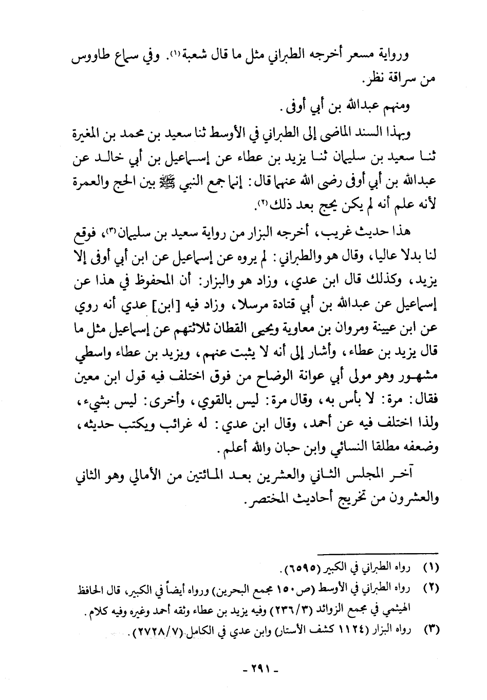 وبهذا السند الماضى إلى الطبراني في الأوسط ثنا سعيد بن محمد بن المغيرة ثنا سعيد بن سليمان ثنا يزيد بن عطاء عن إسماعيل بن أبي خالد عن عبد اللَّه بن أبي أوفى رضي اللَّه عنهما قال: إنما جمع النبي -صلى اللَّه عليه وسلم- بين الحج والعمرة لأنه علم أنه لم يكن يحج بعد ذلك (¬2).