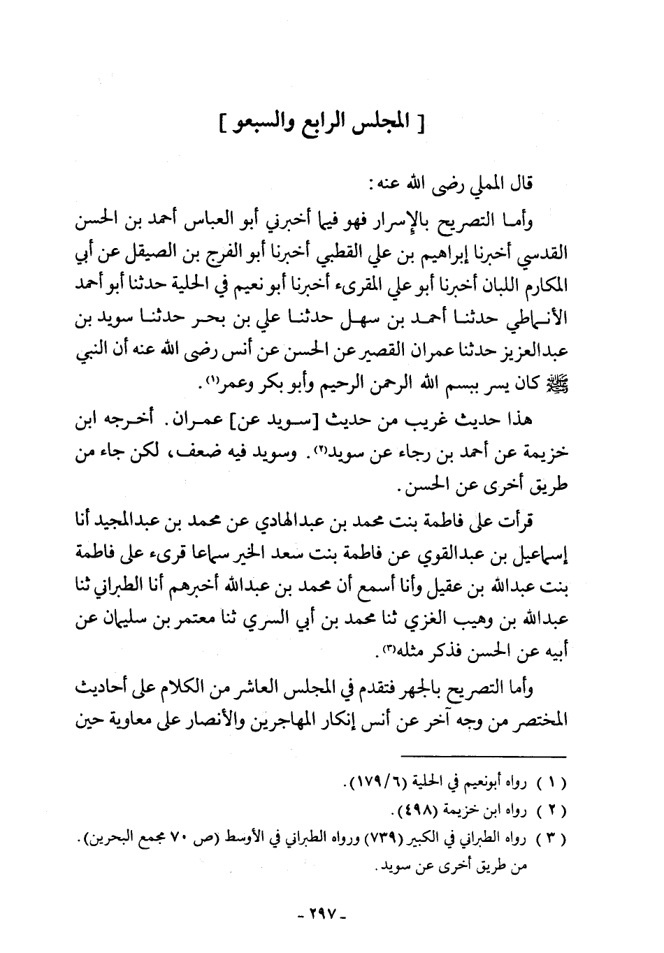 وأما التصريح بالإسرار فهو فيما أخبرني أبو العباس أحمد بن الحسن القدسي أخبرنا إبراهيم بن علي القطبي أخبرنا أبو الفرج بن الصيقل عن أبي المكارم اللبان أخبرنا أبو علي المقرئ أخبرنا أبو نعيم في الحلية حدثنا أبو أحمد الأنماطي حدثنا أحمد بن سهل حدثنا علي بن بحر حدثنا سويد بن عبد العزيز حدثنا عمران القصير عن الحسن عن أنس رضي اللَّه عنه أن النبي -صلى اللَّه عليه وسلم- كان يسر ببِسْمِ اللَّهِ الرَّحْمَنِ الرَّحِيمِ وأبو بكر وعمر (¬1).