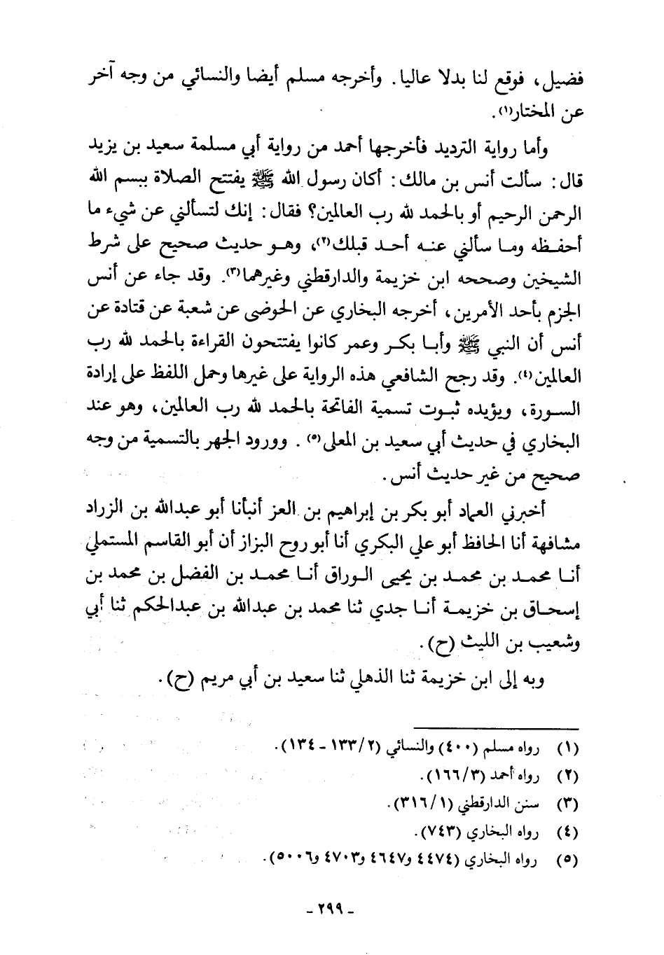 وأما رواية الترديد فأخرجها أحمد من رواية أبي مسلمة سعيد بن يزيد قال: سألت أنس بن مالك: أكان رسول اللَّه -صلى اللَّه عليه وسلم- يفتتح الصلاة ببِسْمِ اللَّهِ الرَّحْمَنِ الرَّحِيمِ أو بالحمد للَّه رب العالمين؟ فقال: إنك لتسألني عن شيء ما أحفظه وما سألني عنه أحد قبلك (¬2)، وهو حديث صحيح على شرط الشيخين وصححه ابن خزيمة والدارقطني وغيرهما (¬3). وقد جاء عن أنس الجزم بأحد الأمرين، أخرجه البخاري عن الحوضى عن شعبة عن قتادة عن أنس أن النبي -صلى اللَّه عليه وسلم- وأبا بكر وعمر كانوا يفتتحون القراءة بالحمد للَّه رب العالمين (¬4). وقد رجح الشافعي هذه الرواية على غيرها وحمل اللفظ على إرادة السورة، ويؤيده ثبوت تسمية الفاتحة بالحمد للَّه رب العالمين، وهو عند البخاري في حديث أبي سعيد بن المعلى (¬5). وورود الجهر بالتسمية من وجه صحيح من غير حديث أنس.