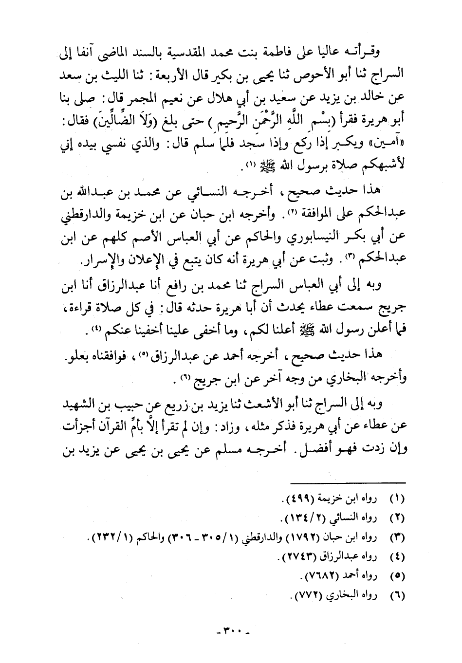وقرأته عاليا على فاطمة بنت محمد المقدسية بالسند الماضى آنفا إلى السراج ثنا أبو الأحوص ثنا يحيى بن بكير قال الأربعة: ثنا الليث بن سعد عن خالد بن يزيد عن سعيد بن أبي هلال عن نعيم المجمر قال: صلى بنا أبو هريرة فقرأ (بِسْمِ اللَّهِ الرَّحْمَن الرَّحيمِ) حتى بلغ (وَلَا الضَّالِّينَ) فقال: "آمين" ويكبر إذا ركع وإذا سجد فلما سلم قال: والذي نفسي بيده إني لأشبهكم صلاة برسول اللَّه -صلى اللَّه عليه وسلم- (¬1).