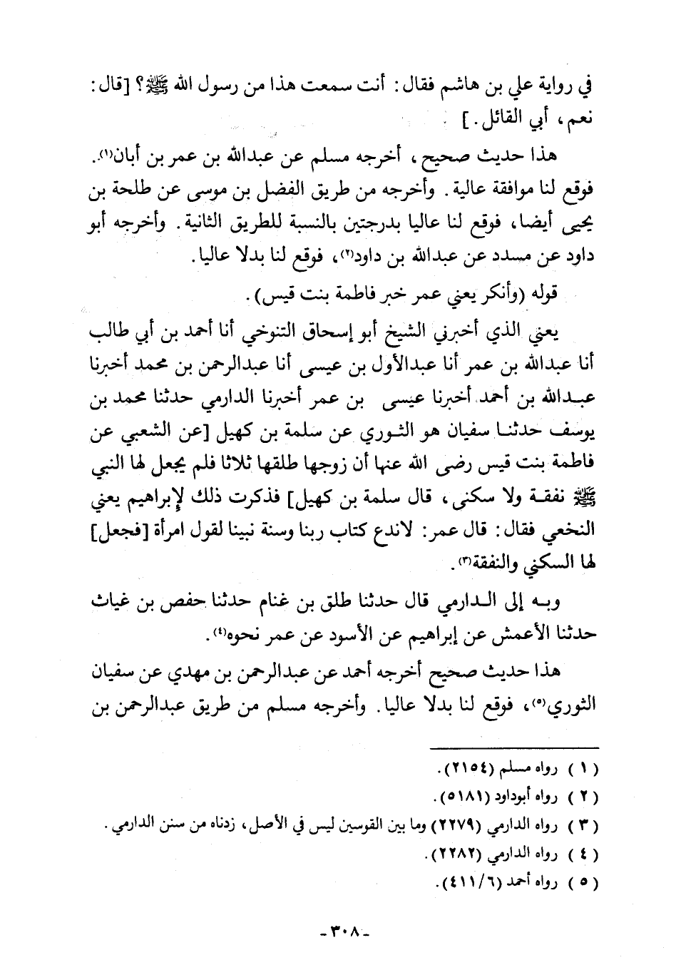 يعني الذي أخبرني الشيخ أبو إسحاق التنوخي أنا أحمد بن أبي طالب أنا عبد اللَّه بن عمر أنا عبد الأول بن عيسى أنا عبد الرحمن بن محمد أخبرنا عبد اللَّه بن أحمد أخبرنا عيسى بن عمر أخبرنا الدارمي حدثنا محمد بن يوسف حدثنا سفيان هو الثوري عن سلمة بن كهيل [عن الشعبي عن فاطمة بنت قيس رضي اللَّه عنها أن زوجها طلقها ثلاثًا فلم يجعل لها النبي -صلى اللَّه عليه وسلم- نفقة ولا سكنى، قال سلمة بن كهيل] فذكرت ذلك لإبراهيم يعني النخعي فقال: قال عمر: لا ندع كتاب ربنا وسنة نبينا لقول امرأة [فجعل] لها السكني والنفقة (¬3).