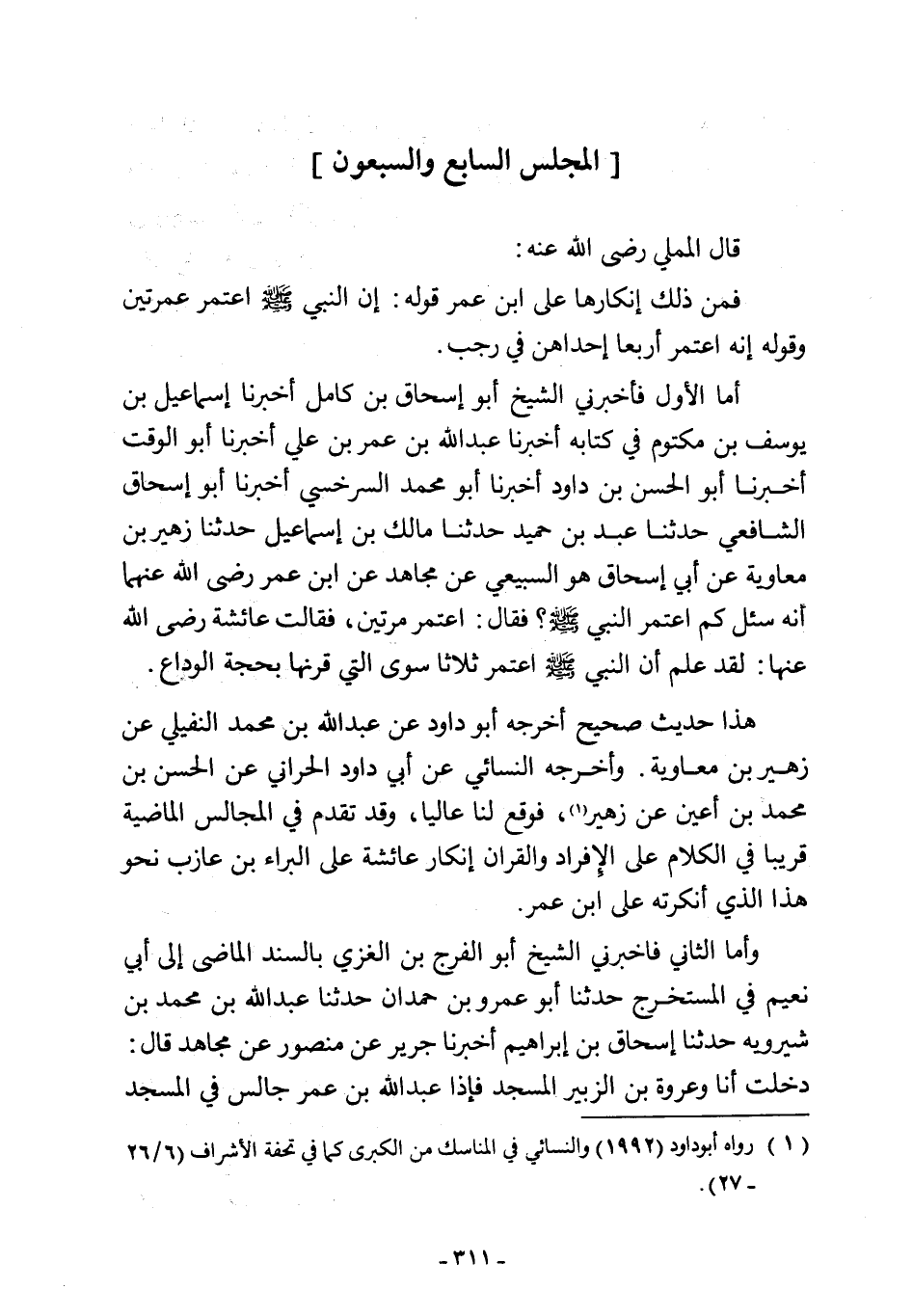 أما الأول فأخبرني الشيخ أبو إسحاق بن كامل أخبرنا إسماعيل بن يوسف بن مكتوم في كتابه أخبرنا عبد اللَّه بن عمر بن علي أخبرنا أبو الوقت أخبرنا أبو الحسن بن داود أخبرنا أبو محمد السرخسي أخبرنا أبو إسحاق الشافعي حدثنا عبد بن حميد حدثنا مالك بن إسماعيل حدثنا زهير بن معاوية عن أبي إسحاق هو السبيعي عن مجاهد عن ابن عمر رضي اللَّه عنهما أنه سئل كم اعتمر النبي -صلى اللَّه عليه وسلم-؟ فقال: اعتمر مرتين، فقالت عائشة رضي اللَّه عنها: لقد علم أن النبي -صلى اللَّه عليه وسلم- اعتمر ثلاثًا سوى التي قرنها بحجة الوداع.