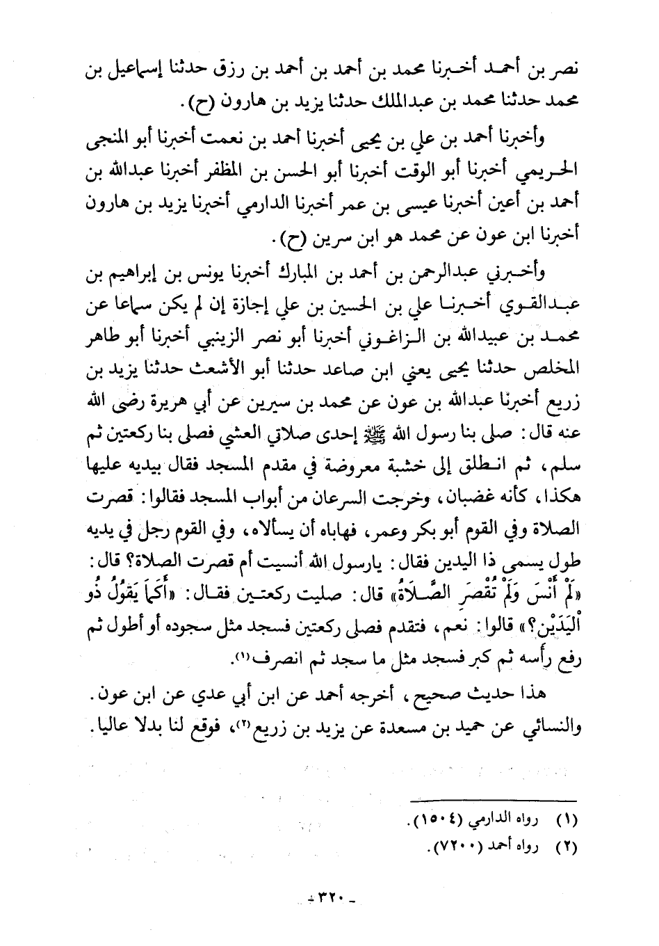 وأخبرني عبد الرحمن بن أحمد بن المبارك أخبرنا يونس بن إبراهيم بن عبد القوي أخبرنا علي بن الحسين بن علي إجازة إن لم يكن سماعًا عن محمد بن عبيد اللَّه بن الزاغوني أخبرنا أبو نصر الزينبي أخبرنا أبو طاهر المخلص حدثنا يحيى يعني ابن صاعد حدثنا أبو الأشعث حدثنا يزيد بن زريع أخبرنا عبد اللَّه بن عون عن محمد بن سيرين عن أبي هريرة رضي اللَّه عنه قال: صلى بنا رسول اللَّه -صلى اللَّه عليه وسلم- إحدى صلاتي العشي فصلى بنا ركعتين ثم سلم، ثم انطلق إلى خشبة معروضة في مقدم المسجد فقال بيديه عليها هكذا، كأنه غضبان، وخرجت السرعان من أبواب المسجد فقالوا: قصرت الصلاة وفي القوم أبو بكر وعمر، فهاباه أن يسألاه، وفي القوم رجل في يديه طول يسمى ذا اليدين فقال: يا رسول اللَّه أنسيت أم قصرت الصلاة؟ قال: "لَمْ أَنْسَ وَلم تُقْصَرِ الصَّلَاةُ" قال: صليت ركعتين فقال: "أَكَمَا يَقوُلُ ذُو اليَدَيْن؟ " قالوا: نعم، فتقدم فصلى ركعتين فسجد مثل سجوده أو أطول ثم رفع رأسه ثم كبر فسجد مثل ما سجد ثم انصرف (¬1).