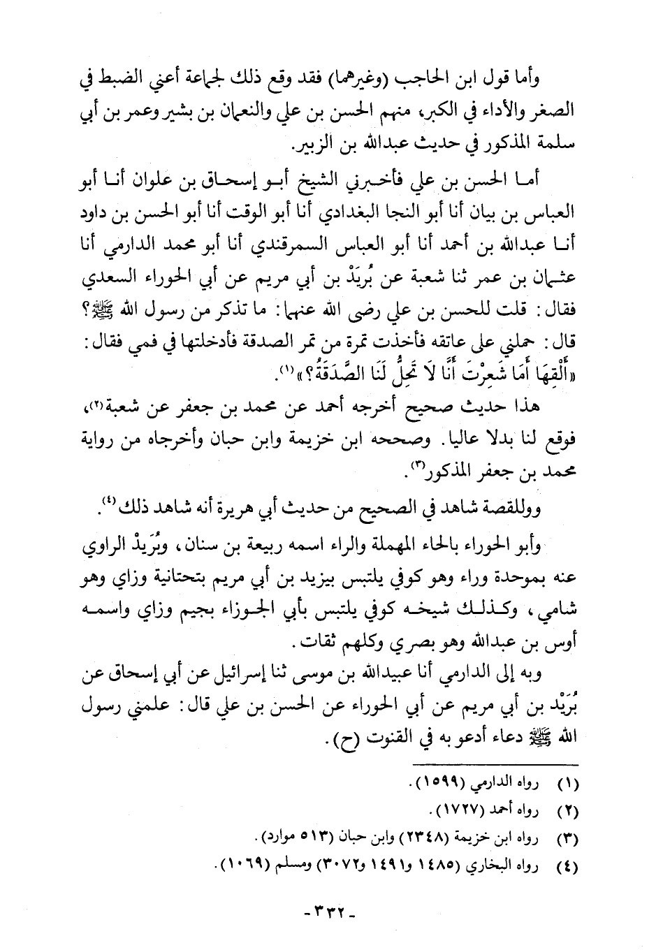 أما الحسن بن علي فأخبرني الشيخ أبو إسحاق بن علوان أنا أبو العباس بن بيان أنا أبو النجا البغدادي أنا أبو الوقت أنا أبو الحسن بن داود أنا عبد اللَّه بن أحمد أنا أبو العباس السمرقندي أنا أبو محمد الدارمي أنا عثمان بن عمر ثنا شعبة عن بُريَدْ بن أبي مريم عن أبي الحوراء السعدي فقال: قلت للحسن بن علي رضي اللَّه عنهما: ما تذكر من رسول اللَّه -صلى اللَّه عليه وسلم-؟ قال: حملني على عاتقه فأخذت تمرة من تمر الصدقة فأدخلتها في فمي فقال: "أَلْقِهَا أَمَا شَعِرْتَ أَنَّا لَا تَحِلُّ لَنَا الصَّدَقَة؟ " (¬1).