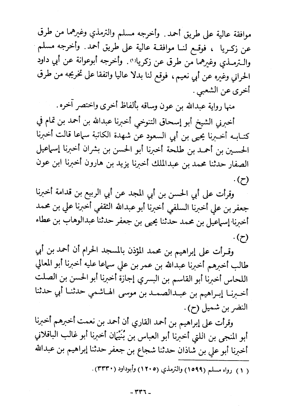 موافقة عالية على طريق أحمد. وأخرجه مسلم والترمذي وغيرهما من طرق عن زكريا، فوقع لنا موافقة عالية على طريق أحمد. وأخرجه مسلم والترمذي وغيرهما من طرق عن زكريا (¬1). وأخرجه أبو عوانة عن أبي داود الحراني وغيره عن أبي نعيم، فوقع لنا بدلًا عاليًا واتفقا على تخريجه من طرق أخرى عن الشعبي.