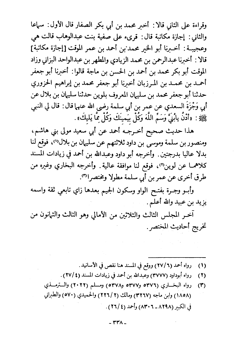 وقراءة على الثاني قالا: أخبر محمد بن أبي بكر الصفار قال الأول: سماعا والثاني: إجازة مكاتبة قال: قرئ على صفية بنت عبد الوهاب قالت هي وعجيبة: أخبرنا أبو الخير محمد بن أحمد بن عمر الموقت [إجازة مكاتبة] قالا: أخبرنا عبد الرحمن بن محمد الزيادي والمطهر بن عبد الواحد البزاني وزاد الموقت أبو بكر محمد بن أحمد بن الحسن بن ماجة قالوا: أخبرنا أبو جعفر أحمد بن محمد بن المرزبان أخبرنا أبو جعفر محمد بن إبراهيم الحزوري حدثنا أبو جعفر محمد بن سليمان المعروف بلوين حدثنا سليمان بن بلال عن أبي وَجْزَةَ السعدي عن عمر بن أبي سلمة رضي اللَّه عنهما قال: قال لي النبي -صلى اللَّه عليه وسلم-: "أدْنُ يا بُنَيَّ وَسَمِّ اللَّهَ وَكُلْ بِيَمينَكَ وَكُلْ مِمَّا يَليكَ".