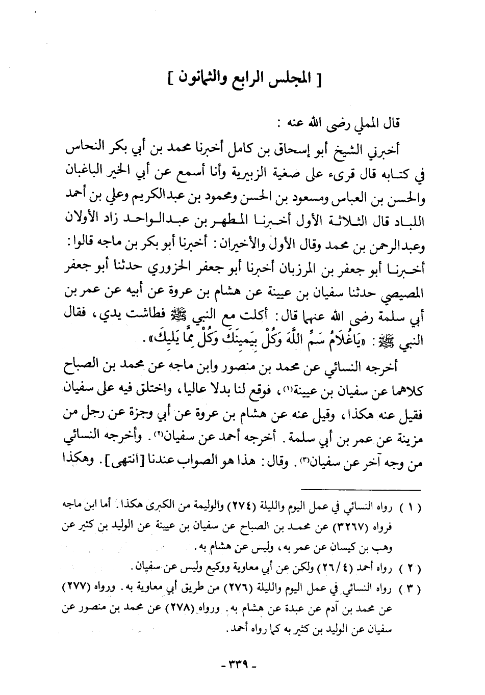 أخبرني الشيخ أبو إسحاق بن كامل أخبرنا محمد بن أبي بكر النحاس في كتابه قال قرئ على صغية الزبيرية وأنا أسمع عن أبي الخير الباغبان والحسن بن العباس ومسعود بن الحسن ومحمود بن عبد الكريم وعلي بن أحمد اللباد قال الثلاثة الأول أخبرنا المطهر بن عبد الواحد زاد الأولان وعبد الرحمن بن محمد وقال الأول والأخيران: أخبرنا أبو بكر بن ماجه قالوا: أخبرنا أبو جعفر بن المرزبان أخبرنا أبو جعفر الحزوري حدثنا أبو جعفر المصيصي حدثنا سفيان بن عيينة عن هشام بن عروة عن أبيه عن عمر بن أبي سلمة رضي اللَّه عنهما قال: أكلت مع النبي -صلى اللَّه عليه وسلم- فطاشت يدي، فقال النبي -صلى اللَّه عليه وسلم-: "يَا غُلَامُ سَمِّ اللَّهَ وَكُلْ بِيَمينَكَ وَكُلْ مِمَّا يَليكَ".